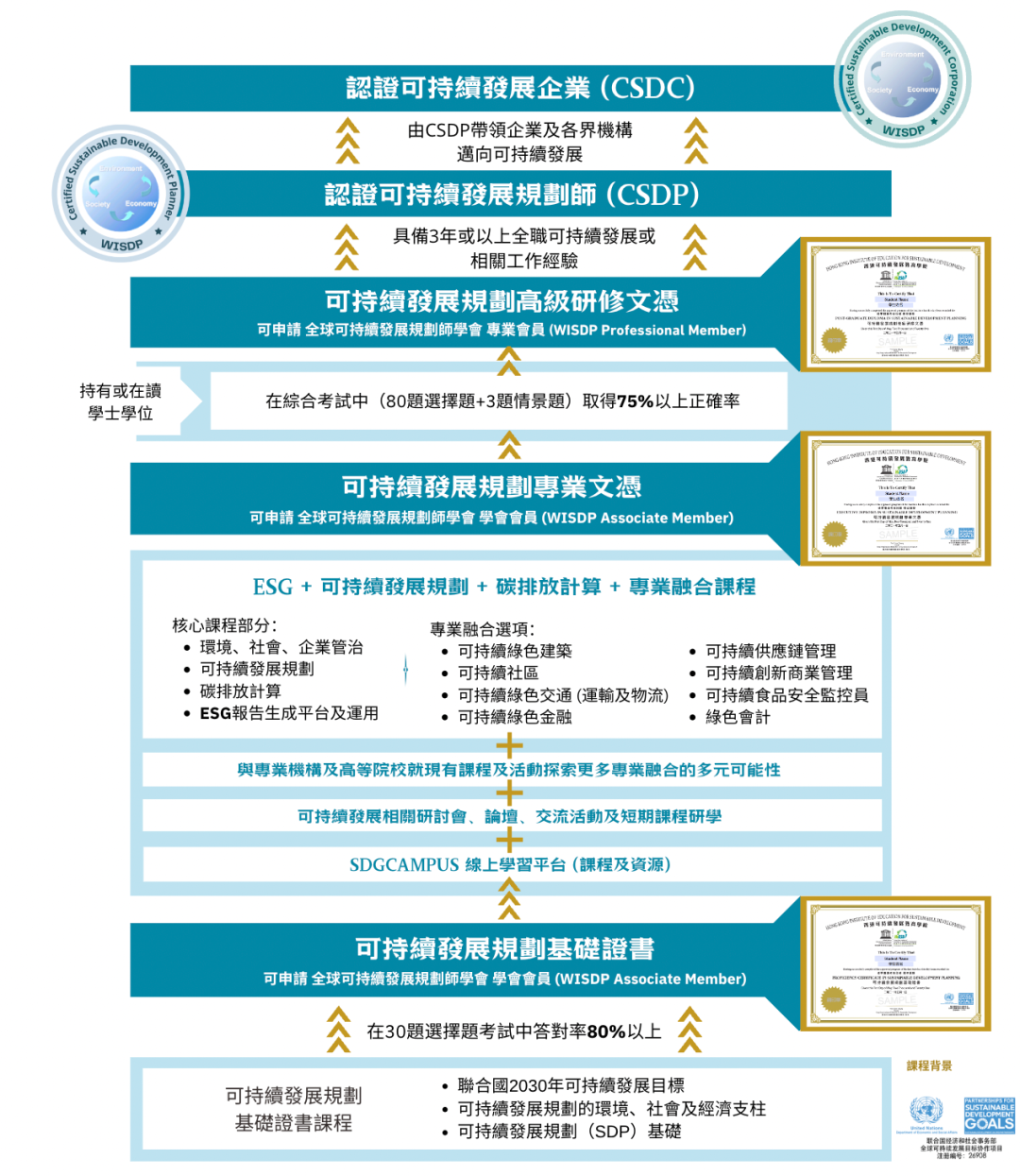 全球可持续发展规划师学会(WISDP)成立于2017年12月,是倡导联合国《2030年可持续发展议程》并促进17个联合国可持续发展目标(UNSDGs)的专业学会。学会致力于协同开展联合国经济和社会事务部(UNDESA)全球可持续发展目标协作项目,为企业、管理、教育领域以及公共部门和非政府组织的专业人士提供认证可持续发展规划师(CSDP)的资格认证和认证可持续发展企业(CSDC)的认证,帮助「认证可持续发展规划师」及「认证可持续发展企业」走向更卓越的成功,促进实现全球可持续发展目标。学会的成立有赖一班来自不同国家、专业领域及国际组织的热心人士,包括诺贝尔奖得主、联合国南南合作办公室(UNOSSC)、联合国负责任管理教育联盟(UNPRME)、联合国教科文组织及协会 、中心(UNESCO & Association, Centre)及高等院校,他们共同商议建立一套完善的专业人员及企业认证系统,在香港联合国教科文组织协会(UHKA)和香港可持续发展教育学院(HiESD)的大力支持下,成立全球可持续发展规划师学会。 至今,学会已汇聚40多间认证可持续发展企业及近300名不同专业领域的人士获认证成为专业会员,服务于各行各业的认证可持续发展规划师,共同携手为香港不同业务及范畴的可持续发展而努力。