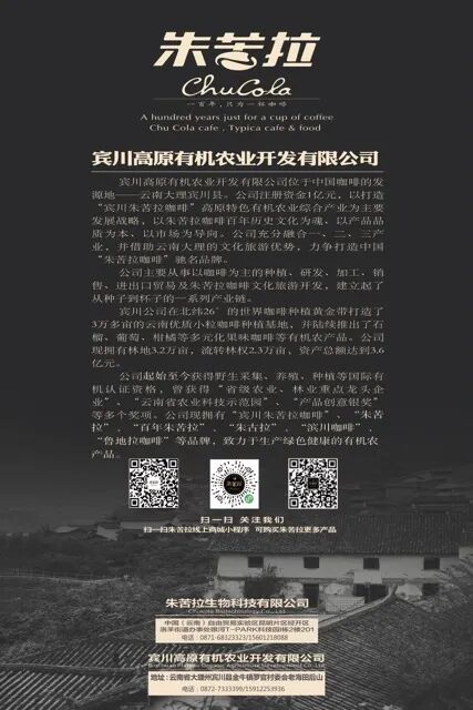 2010 年 11 月 18 日,宾川高原有机农业开发有限公司应势落户宾川,成为朱苦拉咖啡产业发展的核心运营主体,为这颗百年咖啡明珠注入产业化发展活力,品牌自此正式迈入系统化、规模化的发展新征程。十六载深耕不辍,公司创新打造 “公司 + 基地 + 农户 + 科技” 发展模式,以匠心深耕产业链、以创新激活新动能,成功将朱苦拉咖啡打造为集种植、研发、加工、销售、文旅于一体的全产业链有机咖啡品牌,让百年咖啡文化在产业化浪潮中焕发新生。