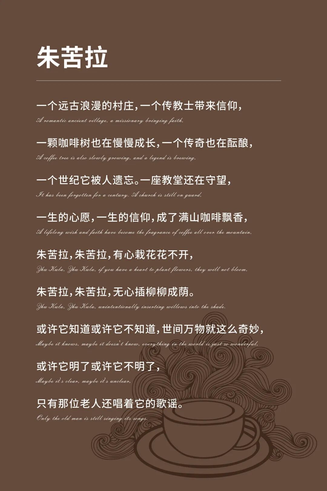 未来愿景:以百年咖啡文化为核心,以全产业链品质为支撑,将 “朱苦拉咖啡”塑造成为中国人心目中的中国民族文化健康咖啡品牌,让世界看见中国咖啡的原生力量,让朱苦拉成为走向世界的中国咖啡文化符号!