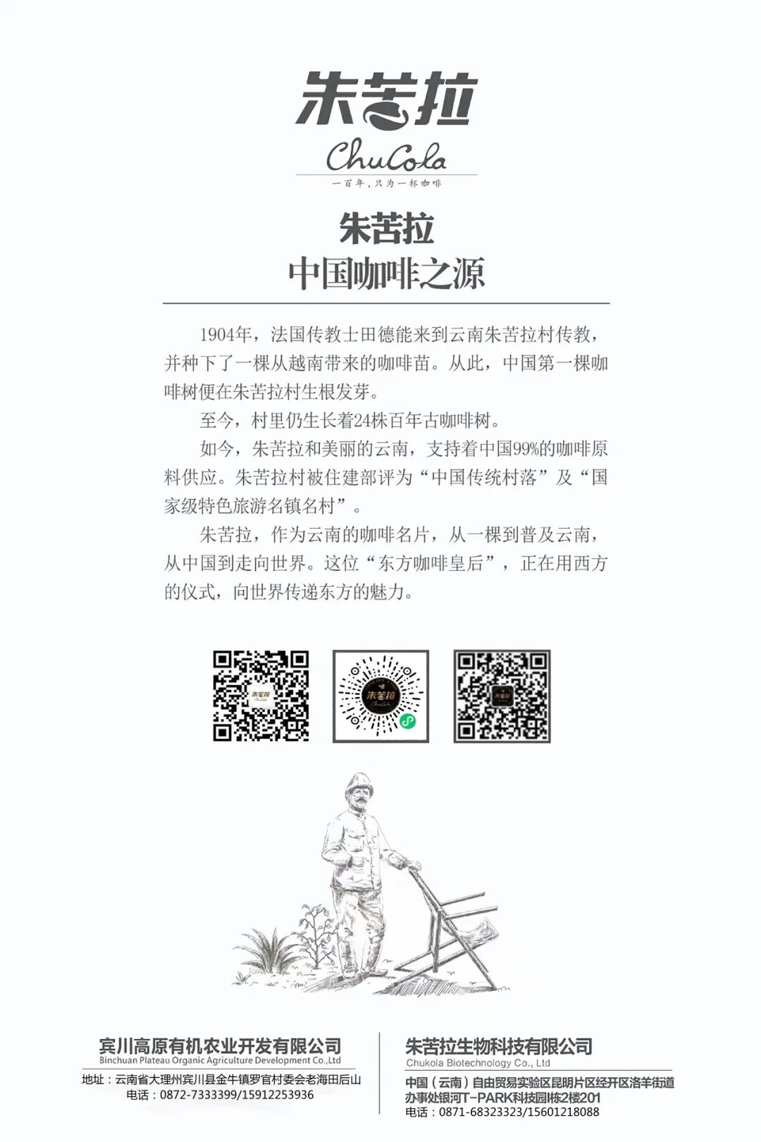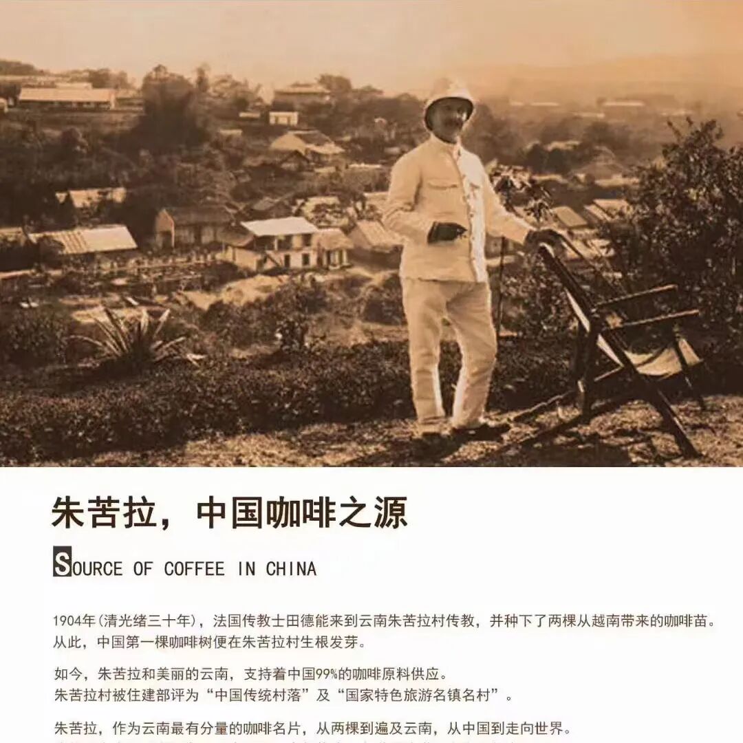 1904年法国传教士田德能神父将阿拉比卡铁皮卡咖啡种苗引入云南宾川朱苦拉村,种下中国第一棵咖啡树。这里留存中国仅有的24棵118年初代古咖啡树、1100棵79年二代古树,是业内公认的中国咖啡发源地与活化石,坐拥国内面积最大、树龄最高、品种最纯正的古咖啡林。百年间咖啡融入村落日常,村民世代种植古法加工,早已养成以咖啡解渴的生活习俗。2010年企业落地宾川,携手政府以科学模式深耕十三载,打通朱苦拉咖啡全产业链,依托百年历史文化打造从田间到餐桌的完整体系,陆续布局大理、昆明多家品牌体验门店,让文化品牌从滇地逐步走向全国、迈向全球,立志将朱苦拉咖啡塑造成根植本土、深入人心的中国民族文化健康咖啡标杆品牌。