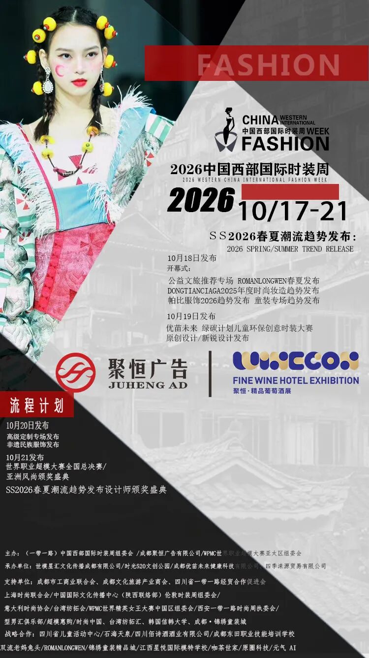 2026年度(一带一路)中国西部国际时装周由聚恒广告精品葡萄酒展携手联合承办、双方将在2026年度达成深度战略及开展多场次时装时尚大秀与精品葡萄酒展联合呈现尝试时尚服饰趋势大秀与传统展会的创新结合,打造多元素多样化多场景的博览会。成都市聚恒广告有限公司是一家致力于全国糖酒商品交易会会期活动策划与会务组织、场景布置与展台设计、工厂制作与搭建等各项服务于一体的专业性会展公司。 公司自成立以来,主要客户群体为全国各地及海外中高端酒类、休闲食品、饮料、调味品企业。旨在为各类型企业与经销商营造一个能相互沟通、交流、达成合作的良好平台。