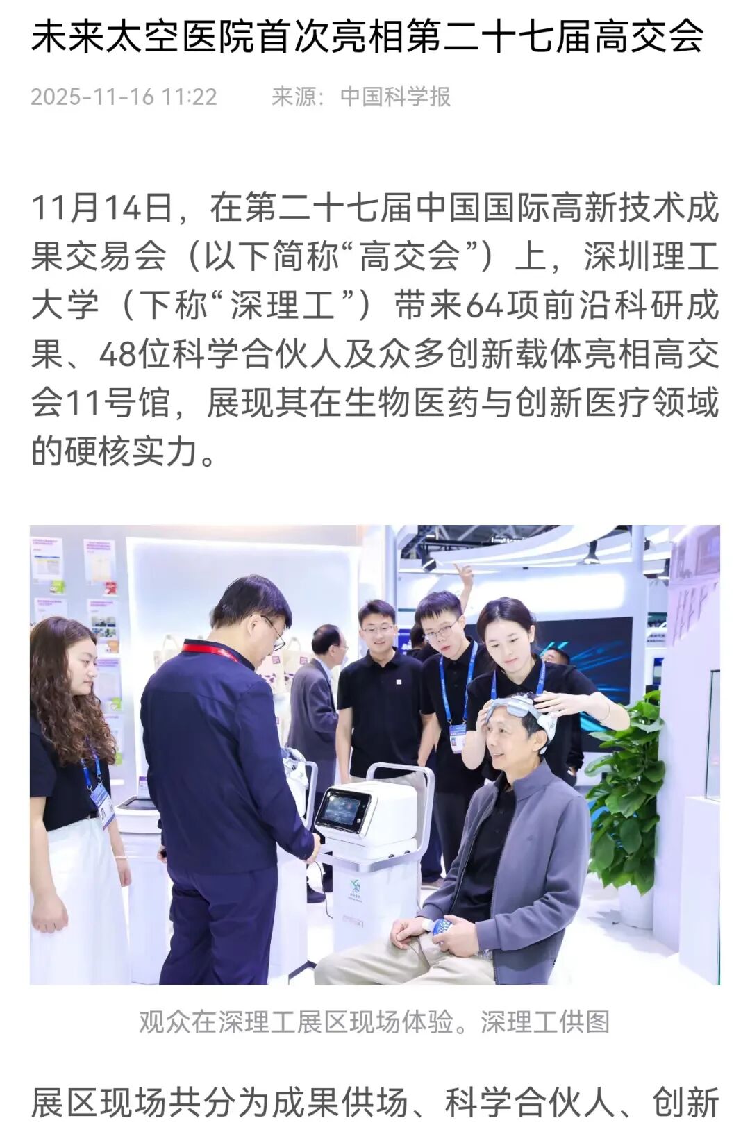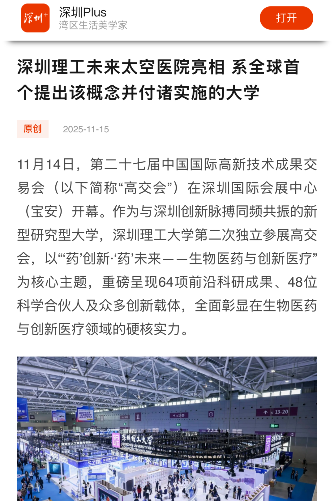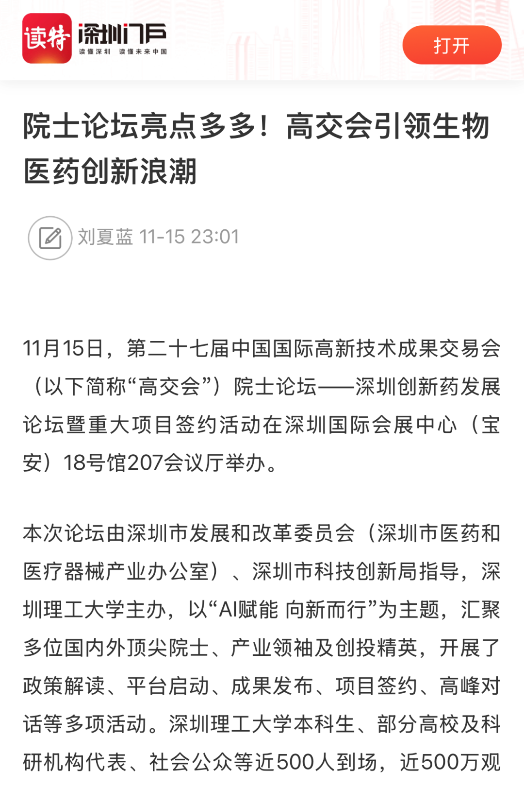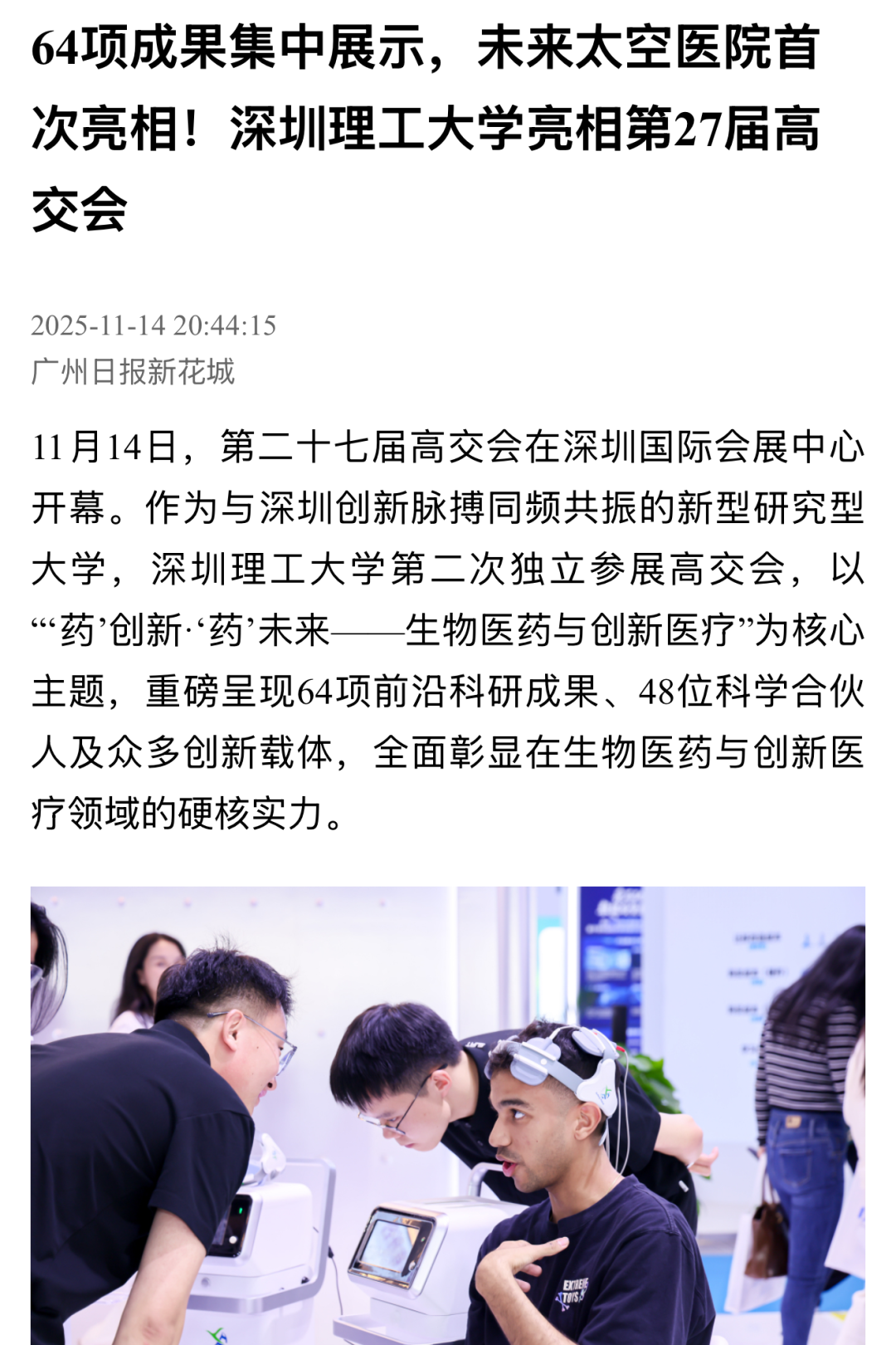 抗脏器衰竭创新药AS1501、针对阿尔茨海默病研发的小分子创新药BrAD-R13等全球领先成果引发高度关注;由深圳理工大学在全球首次提出并付诸实施的“未来太空医院”亮相高交会;高福、谭蔚泓、崔占峰、张绪穆、陈有海、卢洪洲等多位院士专家共同探讨生物医药产业创新发展等话题;深圳市2025年创新药新锐成果发布;深圳理工大学Bio-X国际研究院揭牌成立;围绕科研协作、人才培养等方面完成8个重大项目签约……