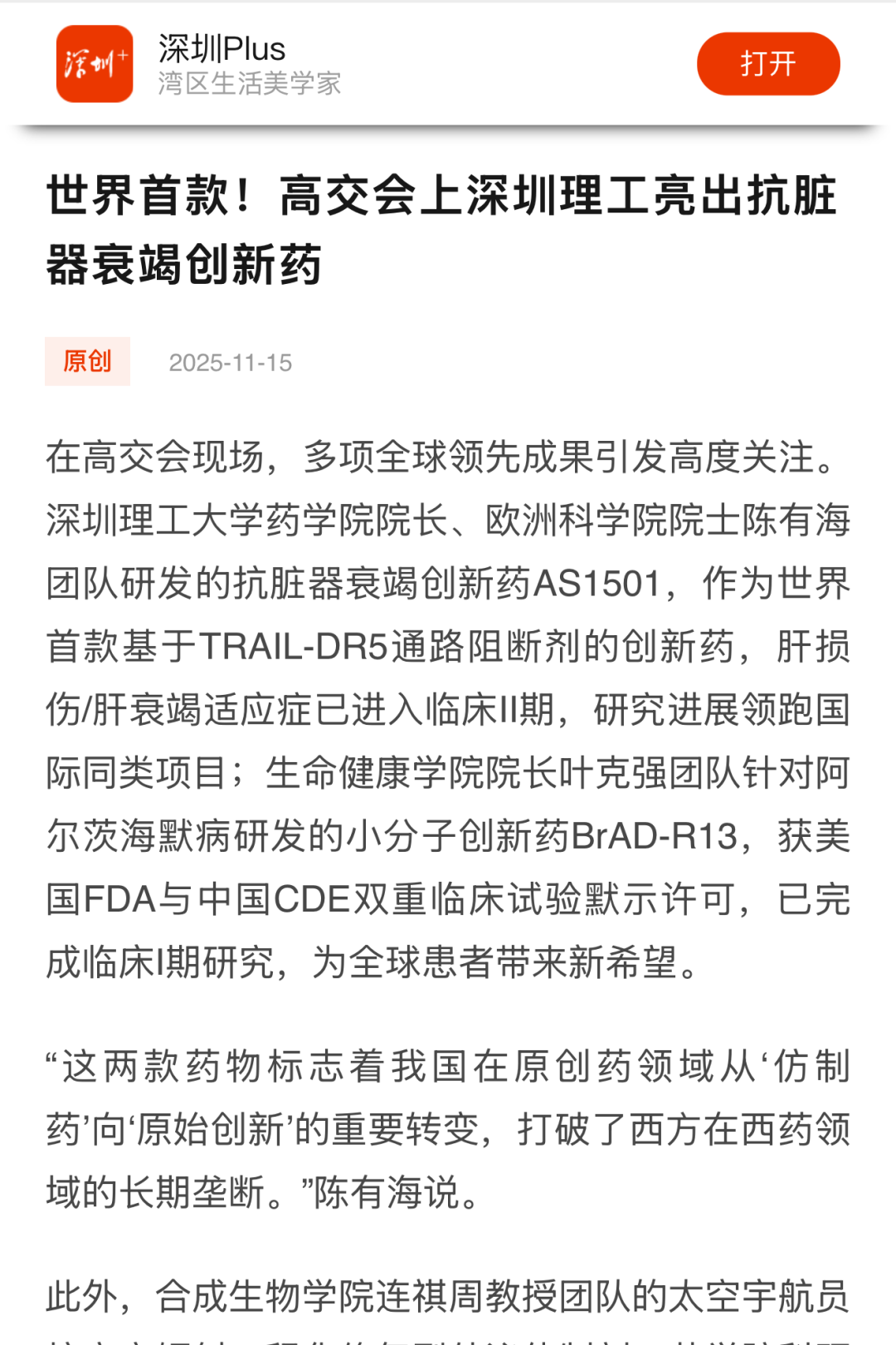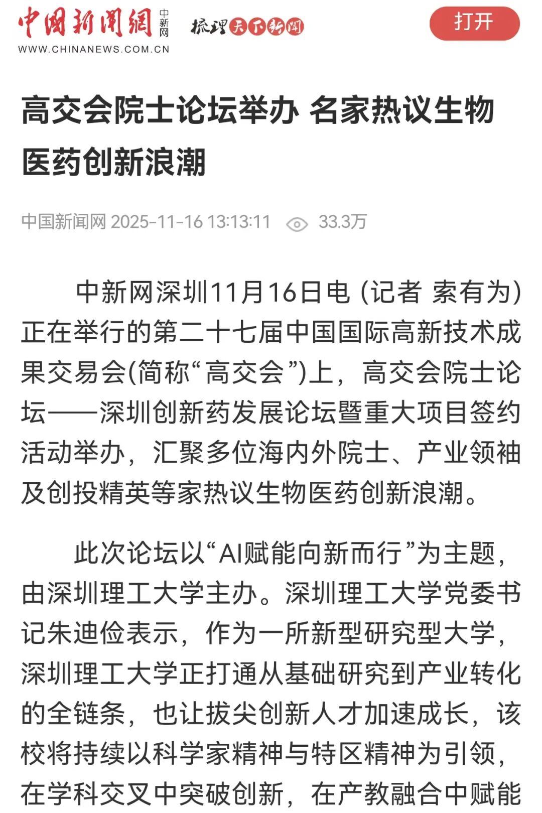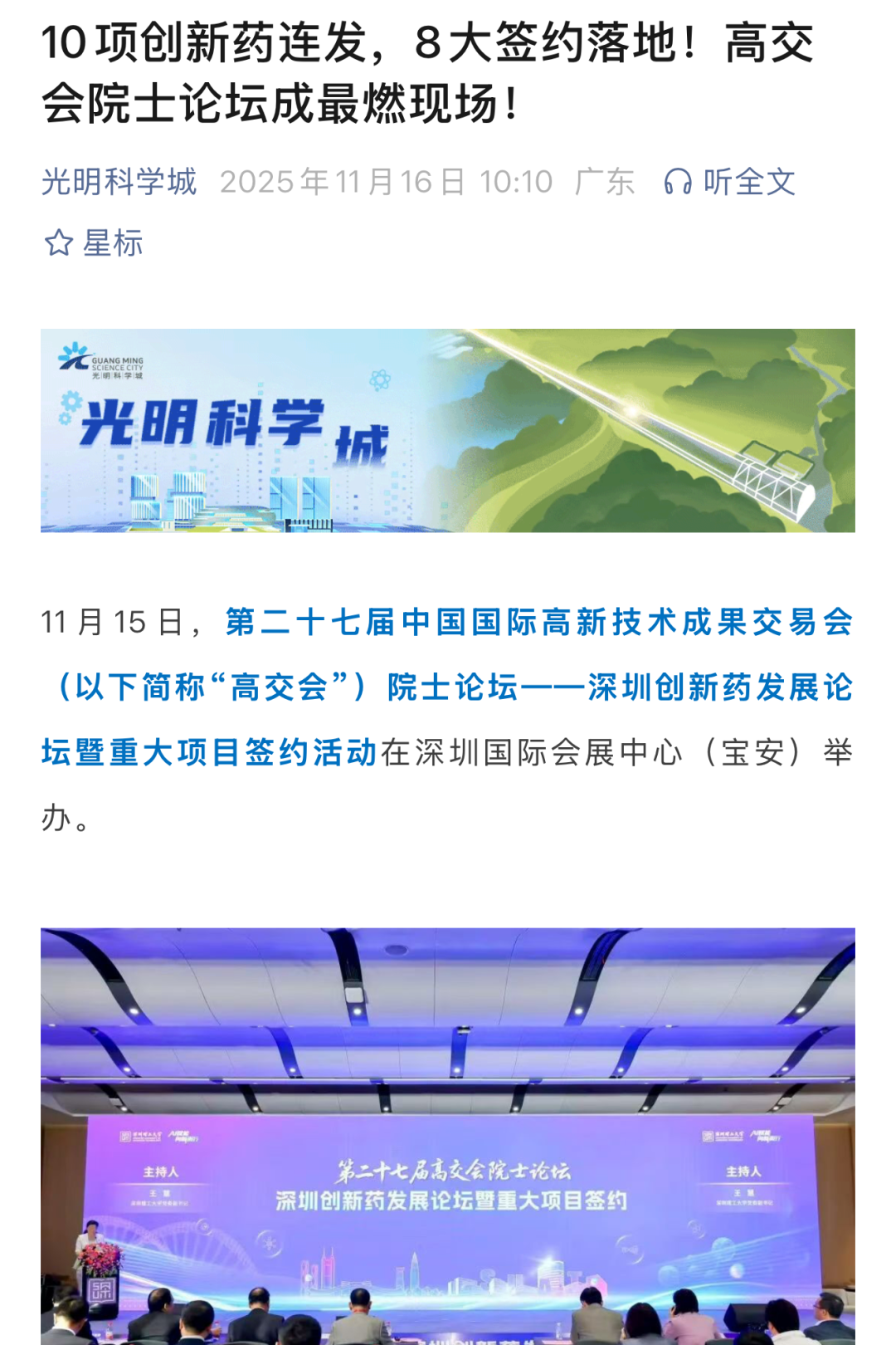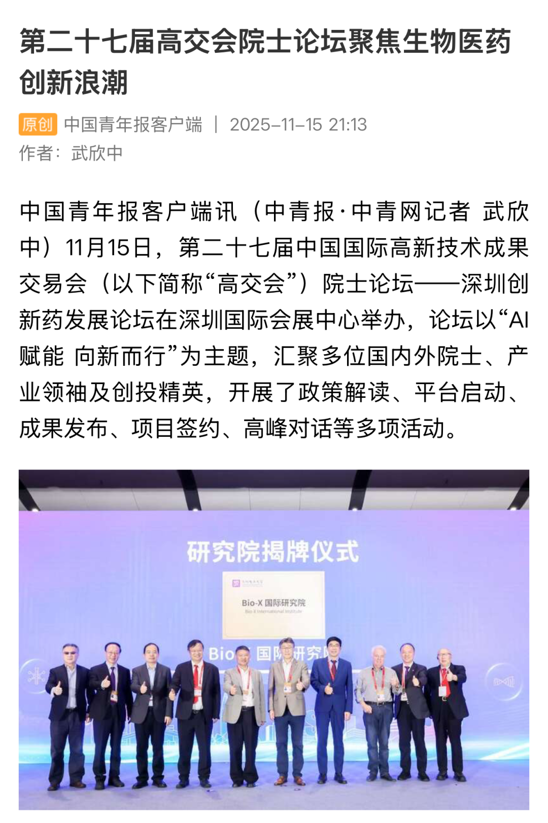抗脏器衰竭创新药AS1501、针对阿尔茨海默病研发的小分子创新药BrAD-R13等全球领先成果引发高度关注;由深圳理工大学在全球首次提出并付诸实施的“未来太空医院”亮相高交会;高福、谭蔚泓、崔占峰、张绪穆、陈有海、卢洪洲等多位院士专家共同探讨生物医药产业创新发展等话题;深圳市2025年创新药新锐成果发布;深圳理工大学Bio-X国际研究院揭牌成立;围绕科研协作、人才培养等方面完成8个重大项目签约……