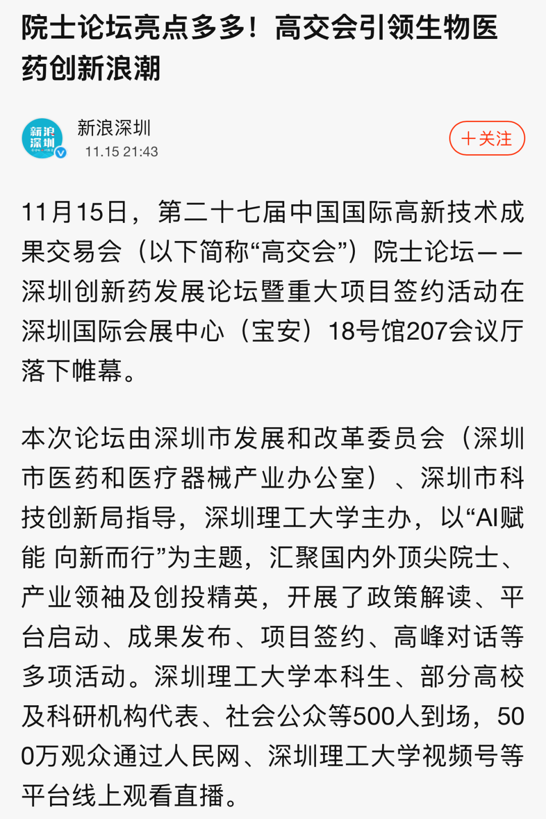 11月16日,为期三天的第二十七届中国国际高新技术成果交易会(简称“高交会”)正式落下帷幕。深圳理工大学第二次以新型研究型大学的身份亮相高校展区,并主办本届高交会唯一一场院士论坛——深圳创新药发展论坛