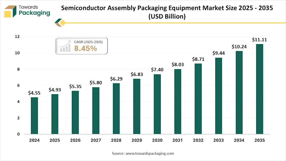 根据 Towards Packaging 最近的一项分析,全球半导体组装封装设备市场预计将从 2026 年的 53.5 亿美元增长到 2034 年的 111.1 亿美元,2025 年至 2034 年的复合年增长率为 8.45%。