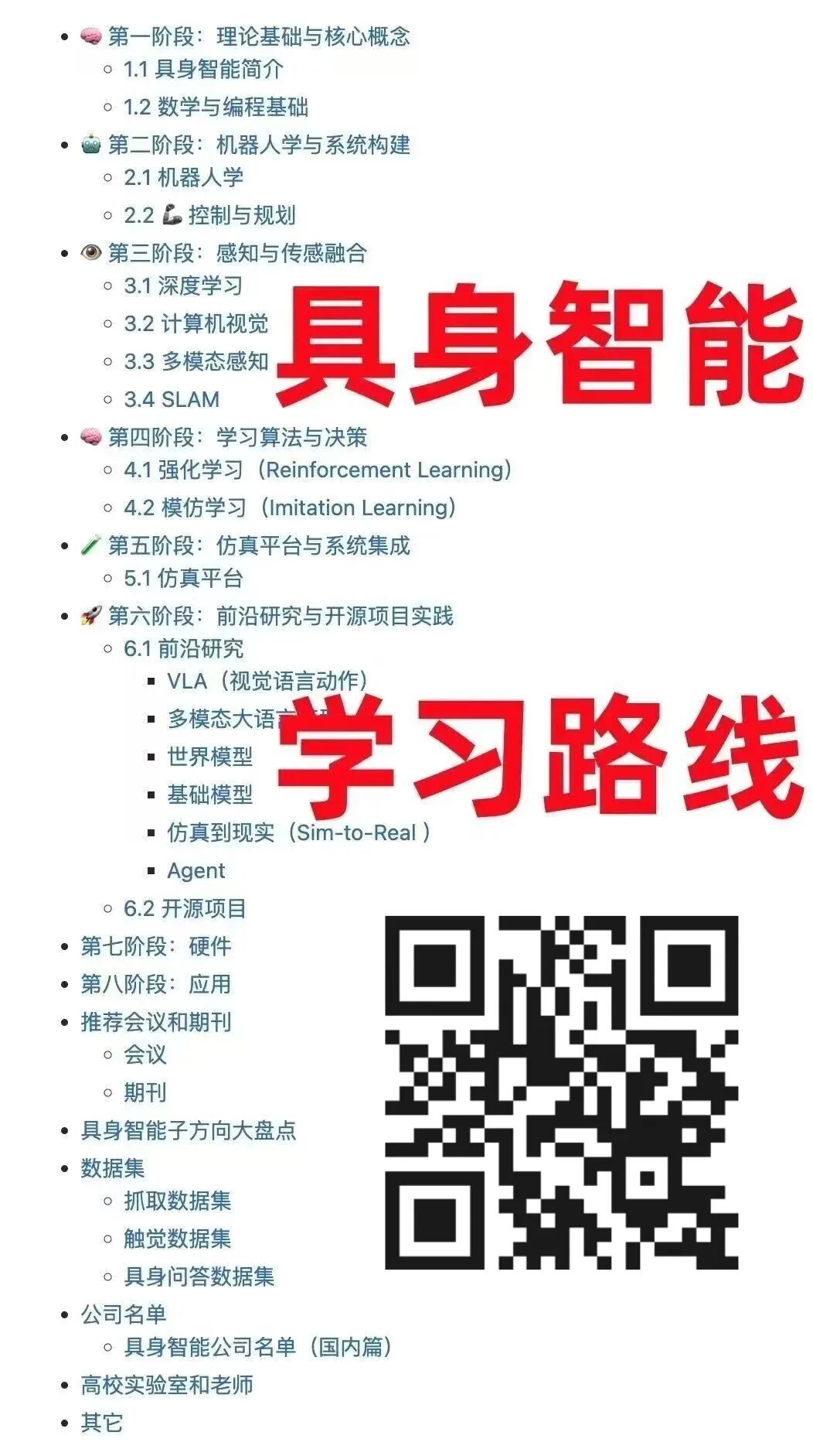 【具身智能】微信群成立!大家快扫码加入具身星球,将获得:最新具身智能技术和项目、❤️ 从入门到精通的学习路线、🤖 具身智能招聘(实习/校招/社招/升学)、具身智能公司名单和高校实验室/教师名单和 👀 行业动态和行业报告等。
