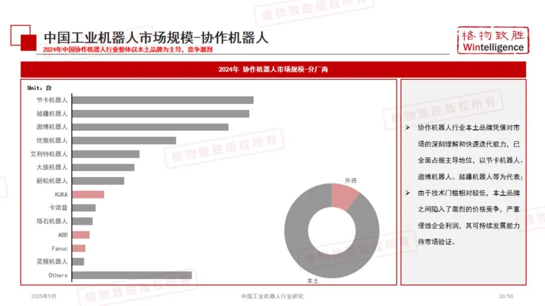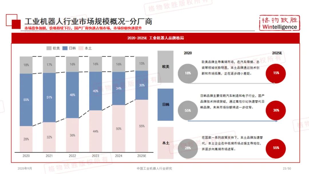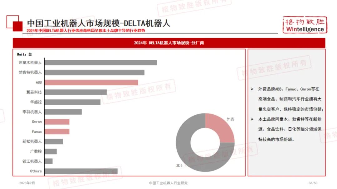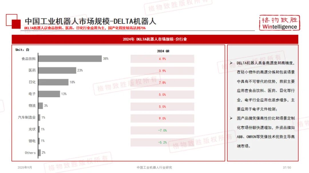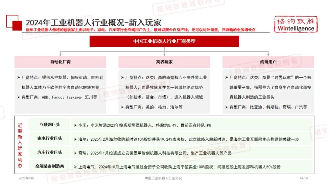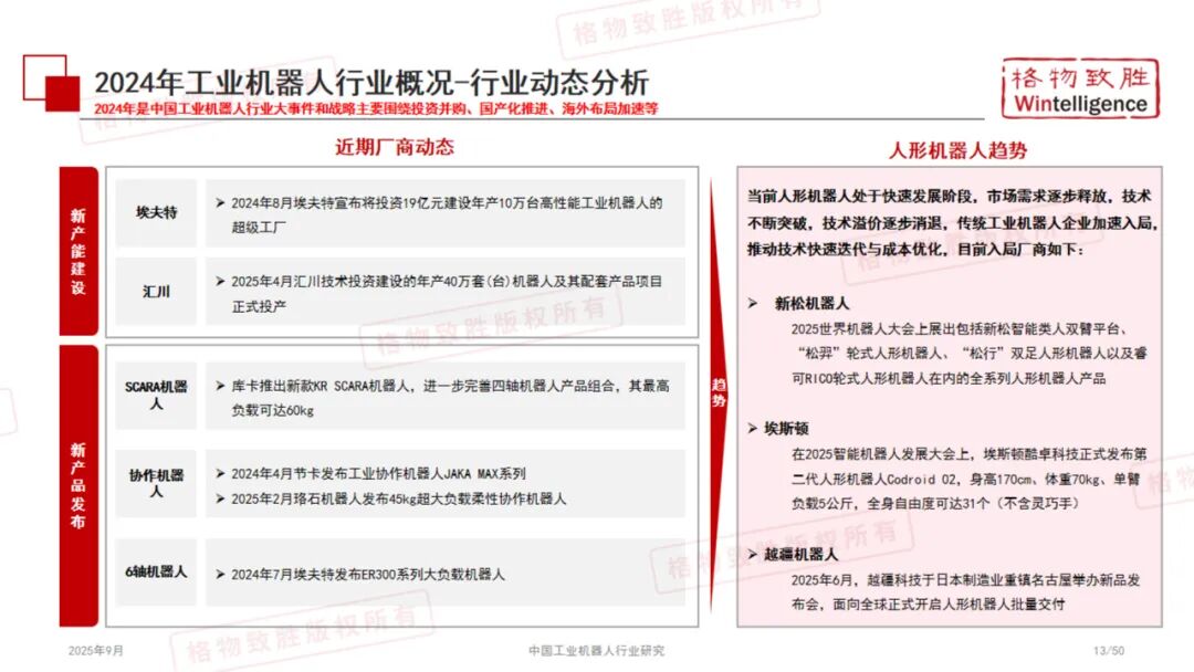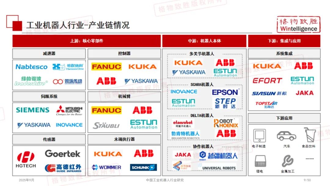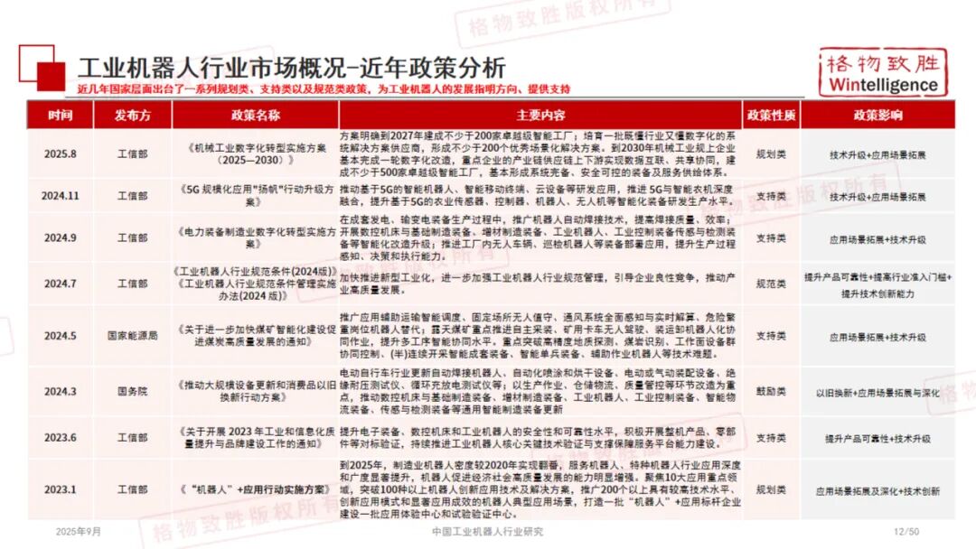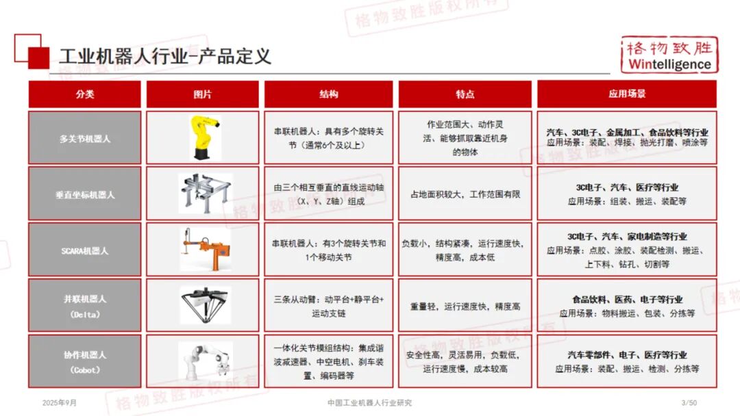 《2025中国工业机器人行业白皮书》由格物致胜(Wintelligence)编撰,是一份全面梳理中国工业机器人产业发展现状、竞争格局与未来趋势的专业研究报告。 本报告基于详实的数据、政策解读与市场调研,从产品定义、产业链结构、政策环境、市场规模、应用场景及典型企业等多个维度展开深入分析,为行业参与者、投资者及政策制定者提供有价值的参考。