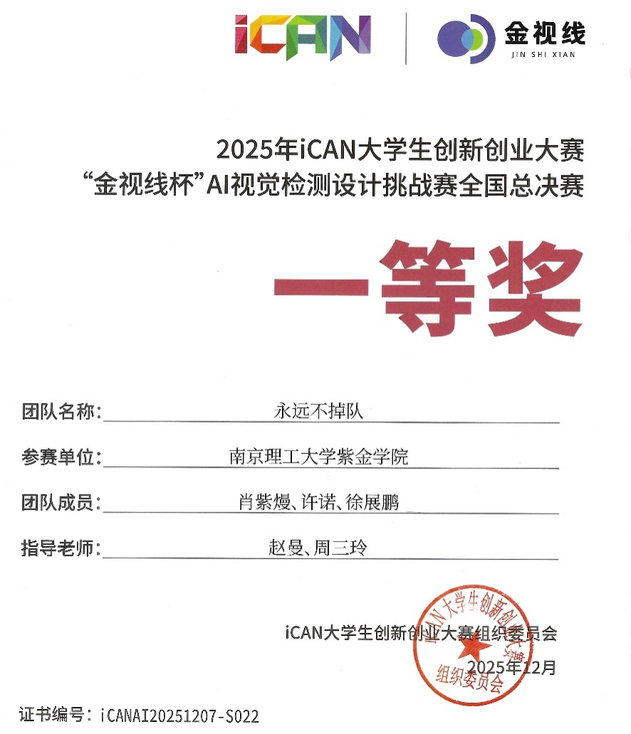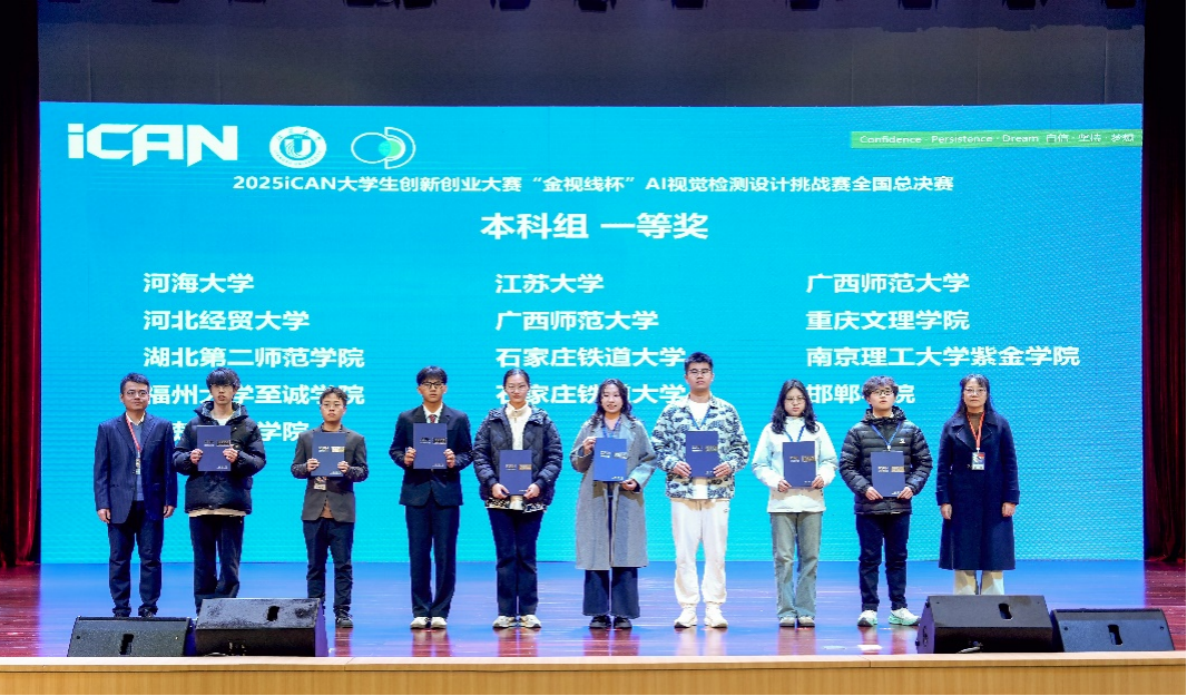 12月5日-7日,2025年iCAN大学生创新创业大赛“金视线杯”AI视觉检测设计挑战赛在江苏大学圆满落幕。我院参赛团队在省赛与全国总决赛中连创佳绩,充分展现了我院学子在人工智能应用与跨学科创新领域的探索精神、实践能力与青春风采。