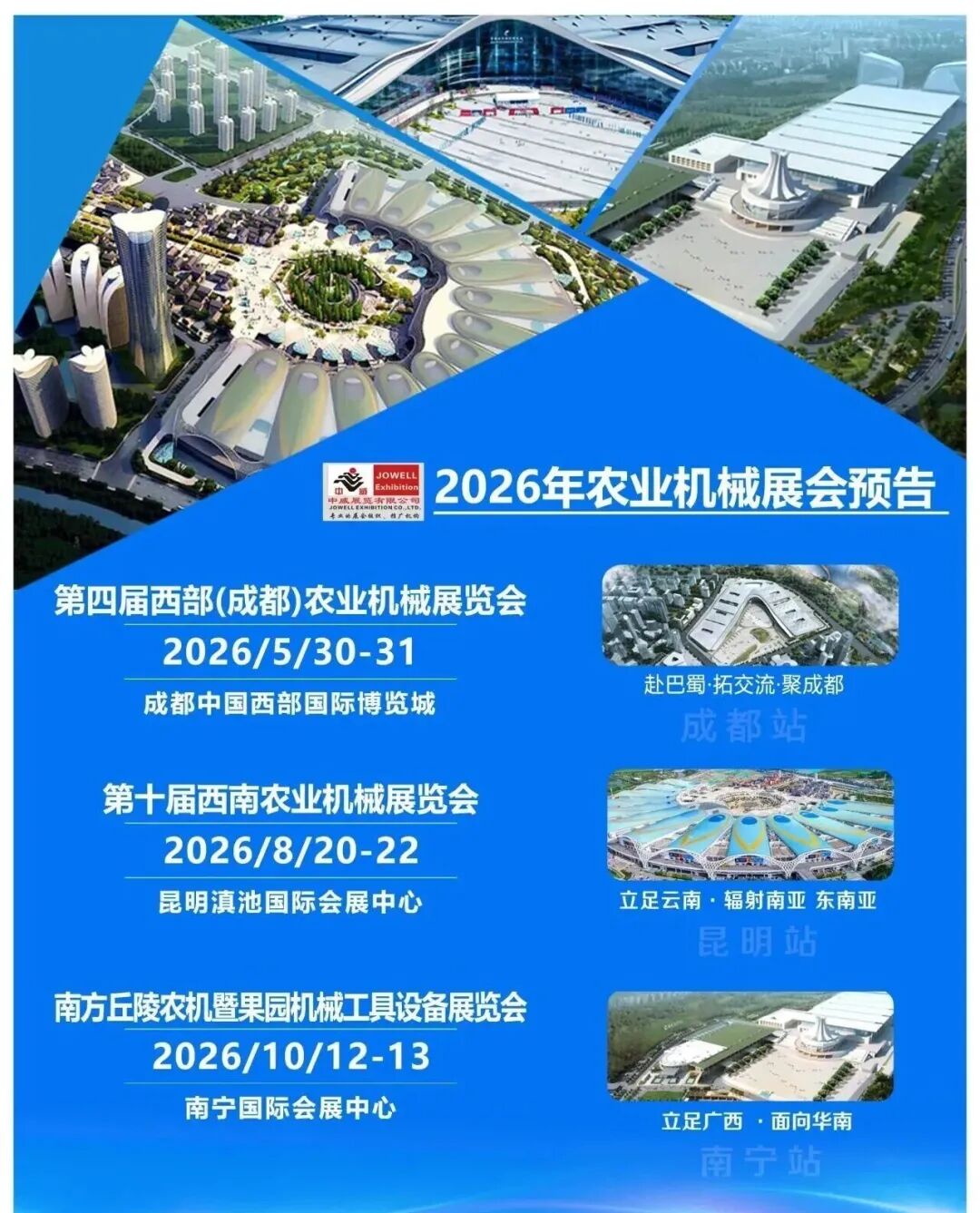 2026第四届西部 (成都) 农业机械展览会紧扣西部农业机械化、智能化发展需求,在往届成功举办的基础上提质向新。展会规划展览面积30000平方米,将汇聚国内外知名农机企业,集中展示拖拉机、收割机、播种机、植保无人机、灌溉设备等高效农机。预计吸引川渝、云贵、陕甘宁等西部省市50000+专业观众,涵盖农机经销商、农业合作社、家庭农场、种植大户等,搭建农机产销对接、技术交流、品牌推广、趋势洞察的核心平台。同期举办高峰论坛,邀请行业专家、企业领袖共话智能农机发展趋势与应用场景,赋能行业高质量发展。(展位预订/展会预登记/展会门票/采购买家注册)商务合作可微信扫码联系工作人员:免责声明:本宣传文案所涉数据、图片、视频等资料部分来源于主办单位及展馆,转载目的在于传递更多信息,内容仅供参考,准确内容以展会官网发布为准。如涉及侵权,请联系删除。
