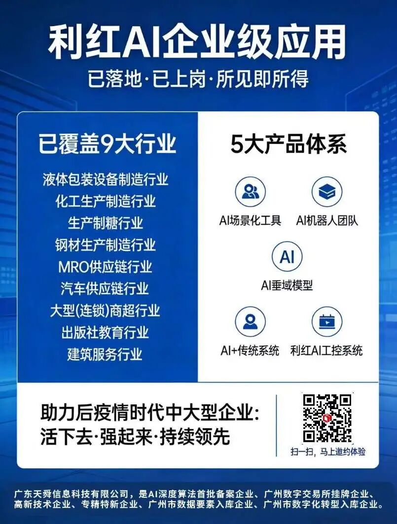 利红AI机器人,广东天舜基于AI技术自主研发的岗位机器人,是经过AI训练师对企业各种岗位或场景的闭环训练,验收后服役的机器人,有效管理提升80%,且无需企业改变任何现状(不用更换系统、不依赖复杂开发,不影响日常工作,不需要停下来休息)。