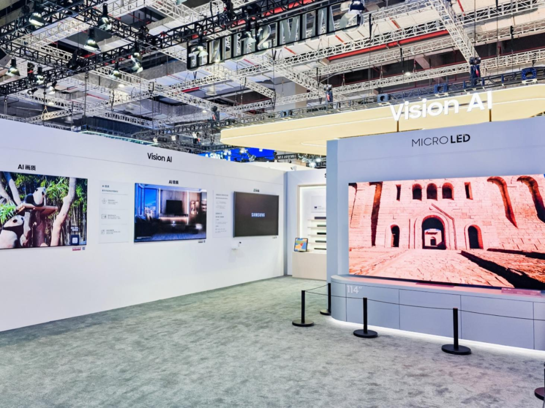与此同时,三星在显示领域继续展现出技术领先性。115英寸Micro RGB电视凭借微米级LED背光实现精准控光,色彩表现力突出;144英寸Micro LED则具备模块化拼接能力,适配多样商用与家用场景。