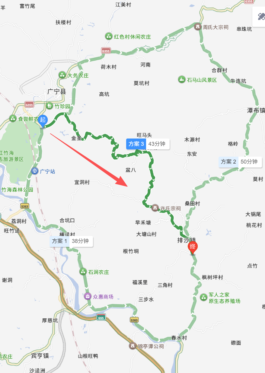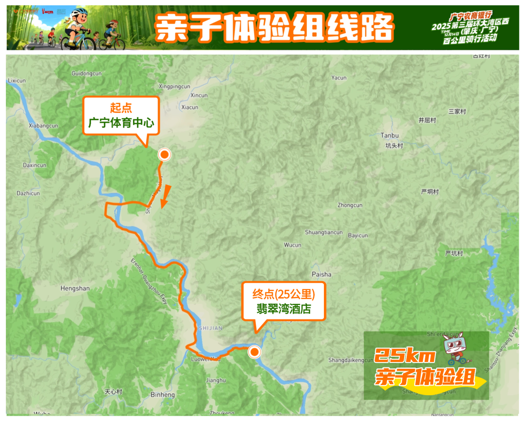 广宁体育中心(起点)-广宁大道-文旅桥-422县道-竹海森林公园-罗帏口--七星村-西林村-吉崀新村-翡翠湾酒店(终点25KM)