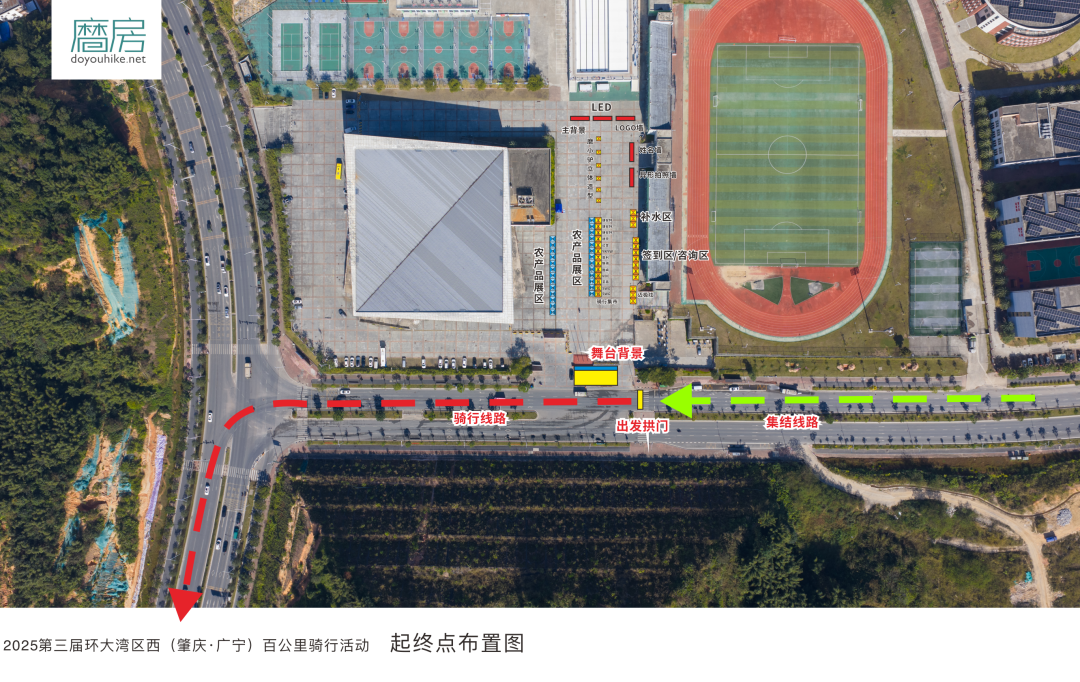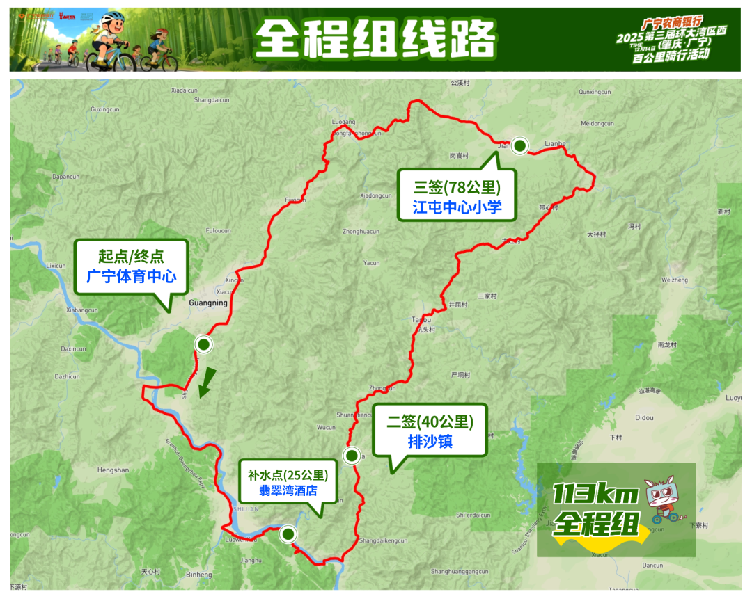 广宁体育中心(起点)-广宁大道-文旅桥-422县道-竹海森林公园-罗帏口--七星村-西林村-吉崀新村-翡翠湾酒店(补水点/亲子体验组终点25KM)-490乡道-263省道-春水中学-418县道-贵子石桥-排沙镇八一希望小学(二签40KM)-418县道-桑田村-三棵古树-大罗村委会-横坑村委会-李竹崀-潭布镇-466乡道-古楼村-467乡道-上半径-茅坳村-旧村-马流坑-带心村-541乡道-荷木崀-260省道-莲花村-河口村-355国道-江屯中心小学(三签/亲子挑战组终点78KM)-355国道-512乡道-水月村委会-道金垌-廖前-香粉村-东方红村-螺岗学校-420县道-石杰凹-林洞村委-富溪八田村-富溪村委会-江美村委会-红太阳村-沙份洼-355国道-柯木咀-黄盆村委会-东环路-黄坪村-东环路-广宁体育中心(终点113KM)