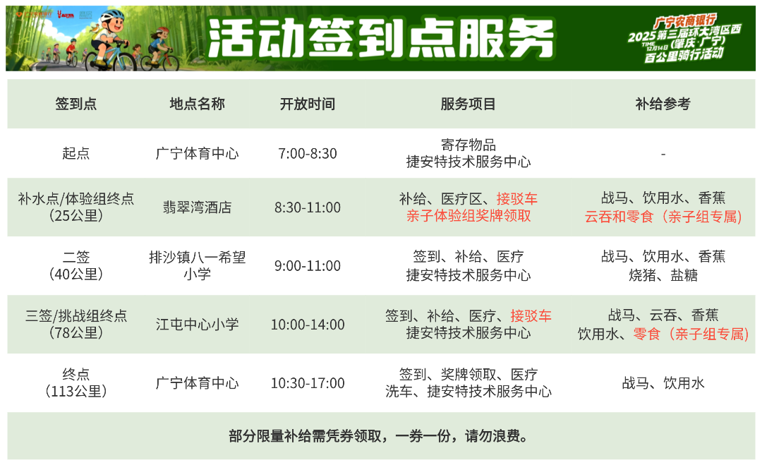 官方补给仅为辅助,建议合理规划个人骑行所需物资。因补水点翡翠湾酒店为住宿区,大家进入时请勿大声喧哗,感谢理解与配合。