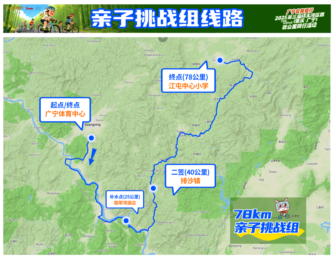 广宁体育中心(起点)-广宁大道-文旅桥-422县道-竹海森林公园-罗帏口--七星村-西林村-吉崀新村-翡翠湾酒店(补水点/亲子组终点25KM)-490乡道-263省道-春水中学-418县道-贵子石桥-排沙镇八一希望小学(二签40KM)-418县道-桑田村-三棵古树-大罗村委会-横坑村委会-李竹崀-潭布镇-466乡道-古楼村-467乡道-上半径-茅坳村-旧村-马流坑-带心村-541乡道-荷木崀-260省道-莲花村-河口村-355国道-江屯中心小学(终点78KM)