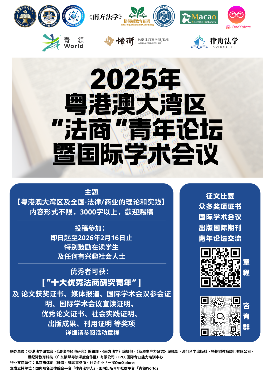 联办单位:香港法学研究会、《法律与经济研究》编辑部、《南方法学》编辑部、《新质生产力研究》编辑部、澳门科学出版社、梧桐树教育顾问有限公司、世纪湾教育科技(广东横琴粤澳深度合作区)有限公司、IPCC国际专业能力培训中心