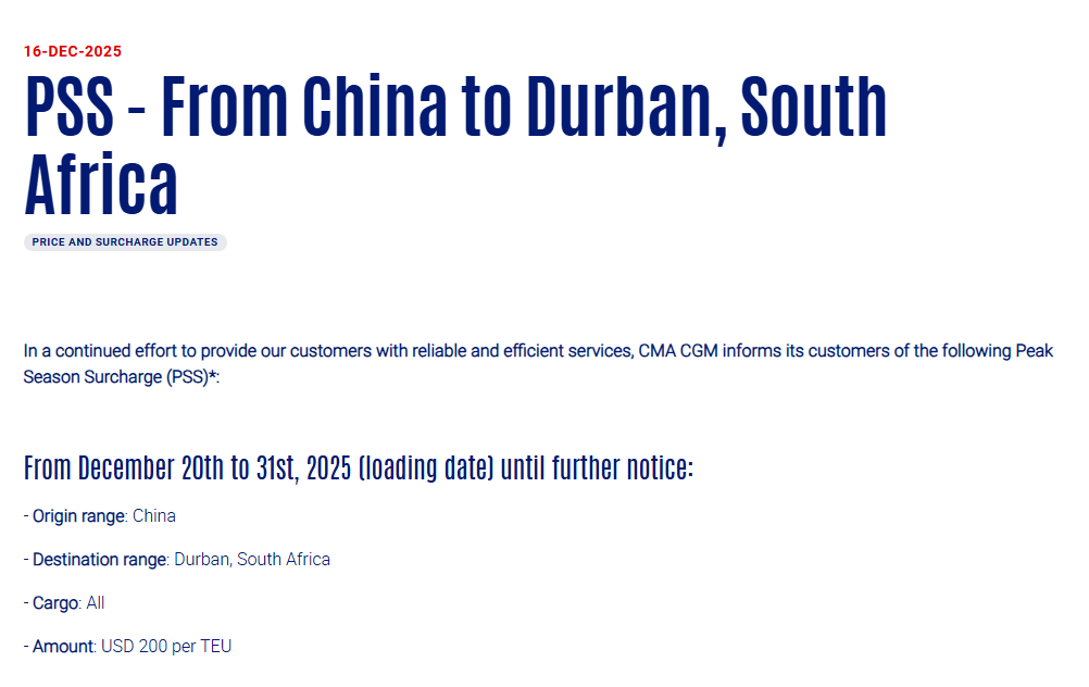 12月16日,达飞宣布,自2025年12月20日至31日(装货日期)起,直至另行通知,从中国至南非德班的全部货物征收旺季附加费(PSS),200 美元/TEU
