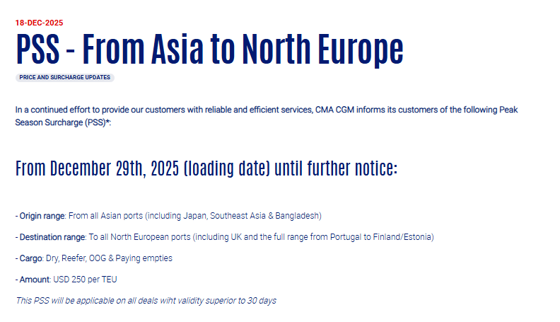 达飞宣布,自2025年12月29日(装货日期)起直至另行通知,亚洲所有港口(包括日本、东南亚和孟加拉国)至北欧所有港口(包括英国以及从葡萄牙到芬兰/爱沙尼亚的全部区域)的货物,征收旺季附加费(PSS),250美元/TEU