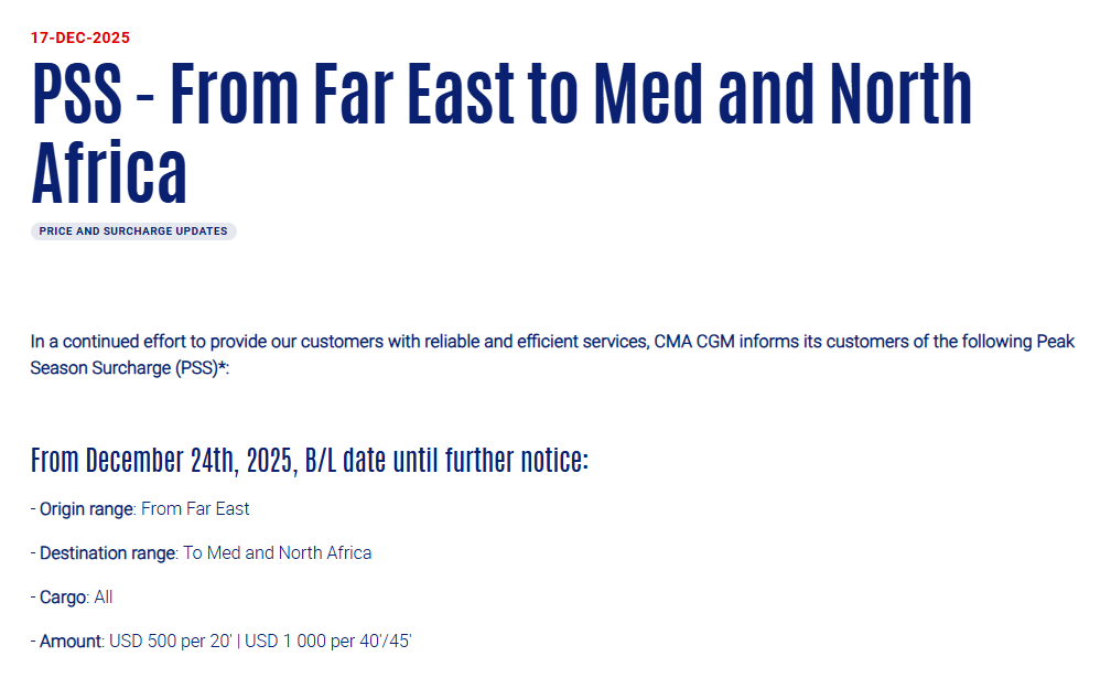 12月17日,达飞宣布为持续向客户提供可靠高效的服务,自2025年12月24日起,直至另行通知,从远东至地中海和北非的所有货物将征收旺季附加费(PSS), 20'集装箱征收500美元,40'和45'集装箱征收1000美元