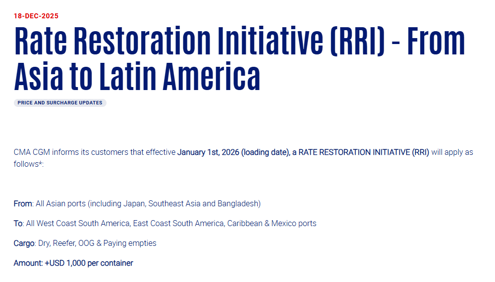 12月18日,达飞发布公告称,自2026年1月1日(装货日)起,将实施RRI,每集装箱1000美元,适用于所有亚洲港口(包括日本、东南亚和孟加拉国)至南美洲西海岸、南美洲东海岸、加勒比海及墨西哥所有港口的货物。