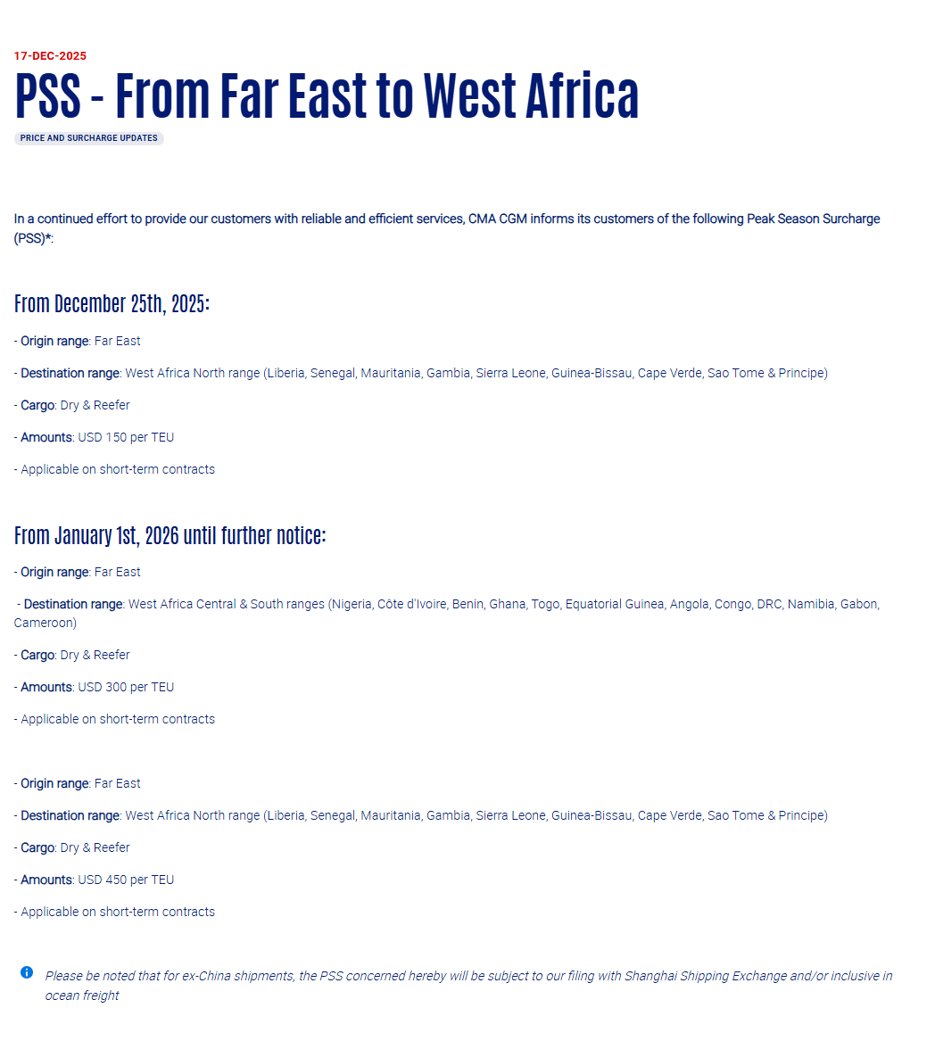 12月17日,达飞宣布,自2025年12月25日起,从远东至西非北部地区的干货和冷藏货物征收旺季附加费(PSS),150美元/TEU
