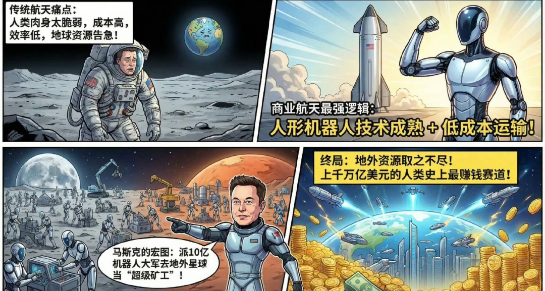 商业航天有一个非常强的逻辑就是,人形机器人技术成熟,可以派10亿数量的人形机器人到月球,甚至其他星球,人类的资源就真的取之不尽了!马斯克就是打算这么做的,因此真正支持商业航天的逻辑就是这个,这是上千万亿美元的赛道,是人类发展以来最赚钱的一个赛道!