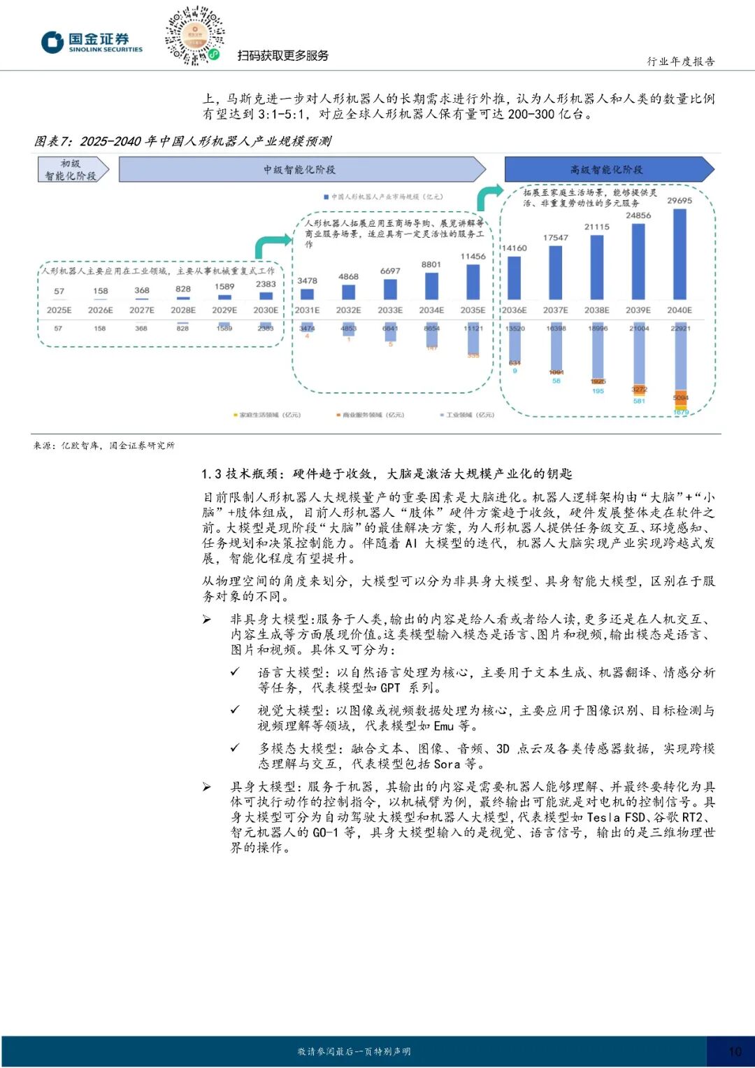 (2)技术跨越:大脑有望突破,上肢能力迭代近奇点。目前人形机器人“肢体”硬件方案趋于收敛,硬件发展领先于算法,算法为人形机器人提供任务级交互、环境感知、任务规划和决策控制能力,是目前技术上的最大痛点,26 年随着大模型逻辑和训练架构迭代,机器人大脑有望实现突破。