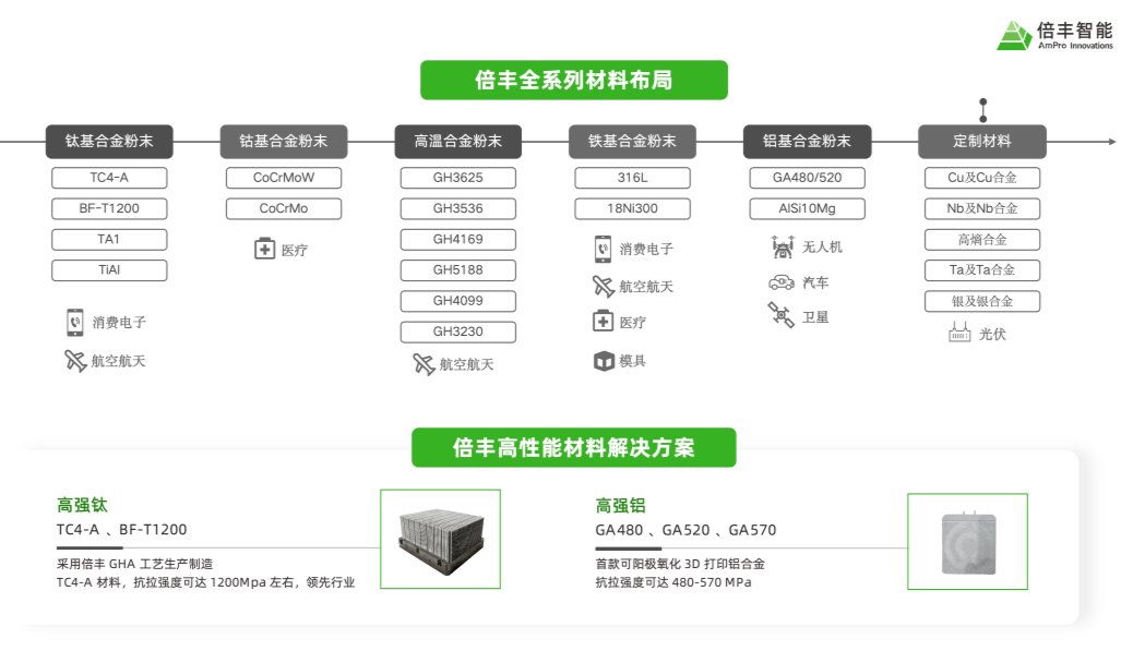 高性能材料矩阵 对标国际顶尖:通过多年基础研发,倍丰智能围绕高性能金属粉末材料,已推出了GA高强铝系列、高纯铜系列、高性能钛系列,包括GA480、GA520、GA570、TC4-A、BF T1200、纯铜、纯钛等,性能均达到行业头部,具备国际竞争力。