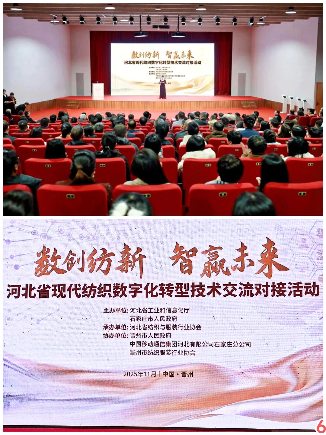 11月12日至13日,“河北省现代纺织数字化转型技术交流对接活动”在晋州市成功举办。本次活动由河北省工业和信息化厅、石家庄市人民政府共同主办,河北省纺织与服装行业协会承办,晋州市人民政府、中国移动通信集团河北有限公司石家庄分公司、晋州市纺织服装行业协会共同协办。活动以“数创纺新·智赢未来”为主题,通过政策解读、主旨演讲、技术分享、实地调研、案例交流及项目签约等形式,为政企研多方搭建高效对接桥梁,加速河北纺织产业从“制造”向“智造”跨越。