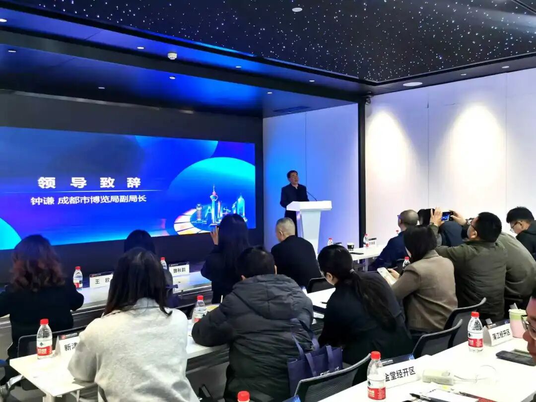 成都市博览局党组成员、副局长钟谦出席活动并致辞,成都市经信局市新经济委、四川天府新区文创和会展局、成都国际商会等单位相关负责人,以及东浩兰生上海工业商务展览有限公司、汉诺威米兰展览(上海)有限公司、四川鹏璨文化传媒有限公司等展会主办等单位代表出席活动,活动由四川天展展览有限公司副总经理董铮主持。