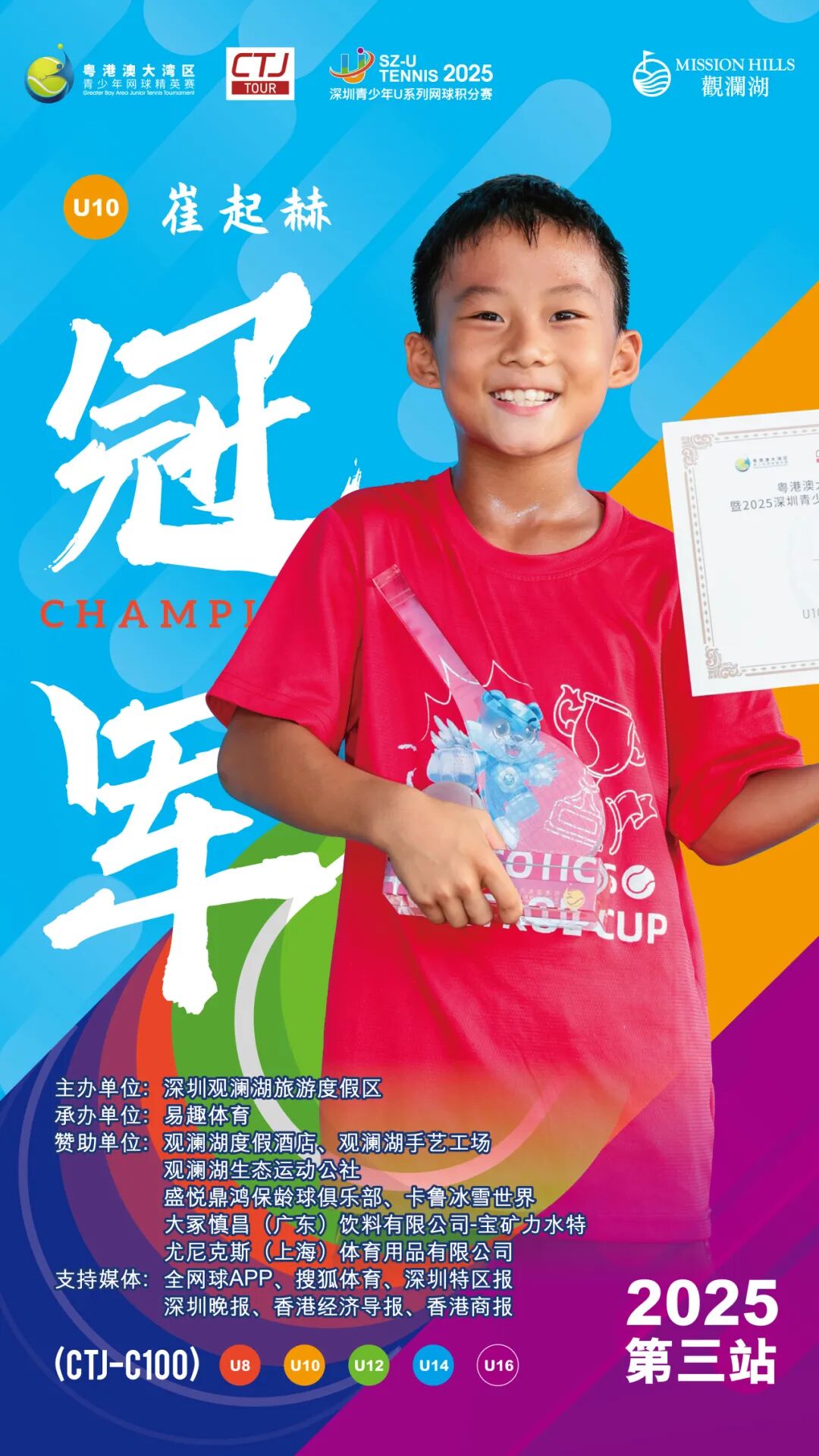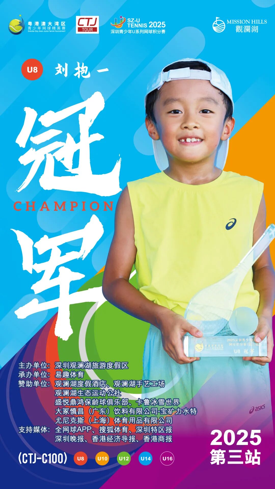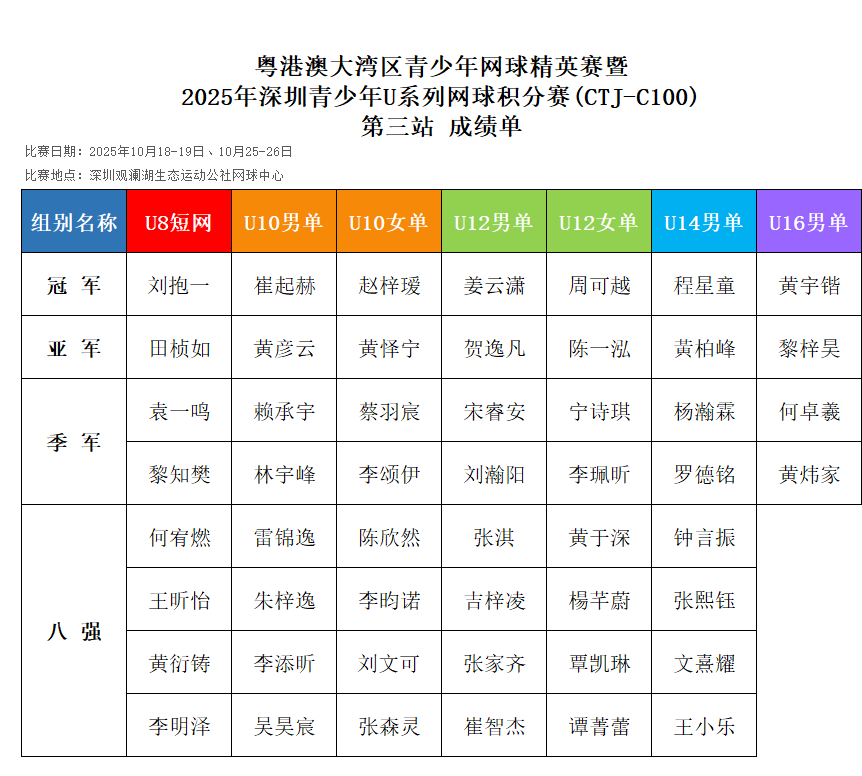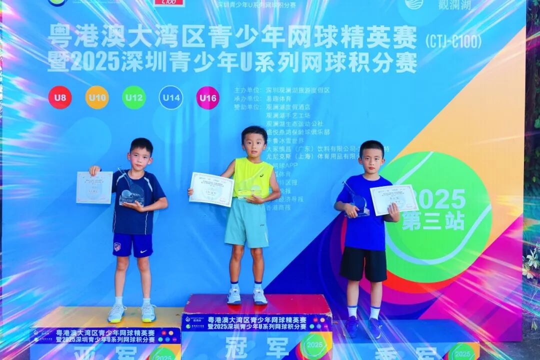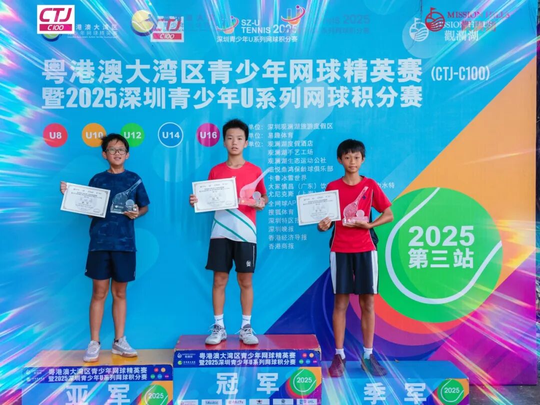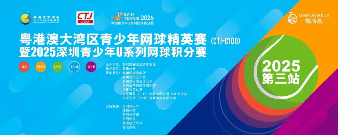 10月18-19日、10月25-26日,粤港澳大湾区网球精英赛暨2025深圳青少年U系列网球积分赛第三站(CTJ-C100)在深圳市观澜湖生态运动公社网球中心圆满收官。本次比赛经过四天激烈角逐,决出U8短网、U10男女单打、U12男女单打、U14男子单打、U16男子单打七个组别冠军。