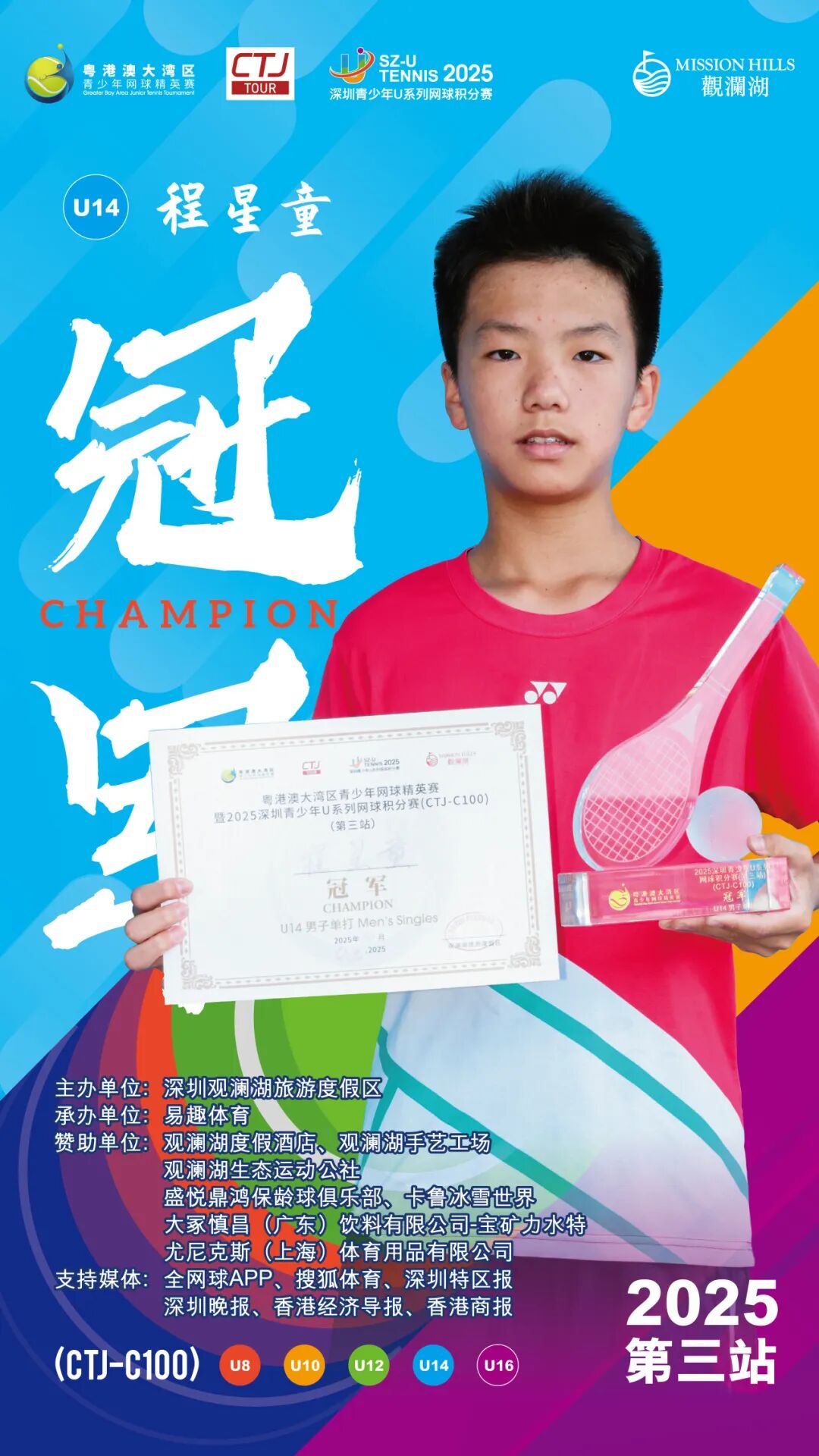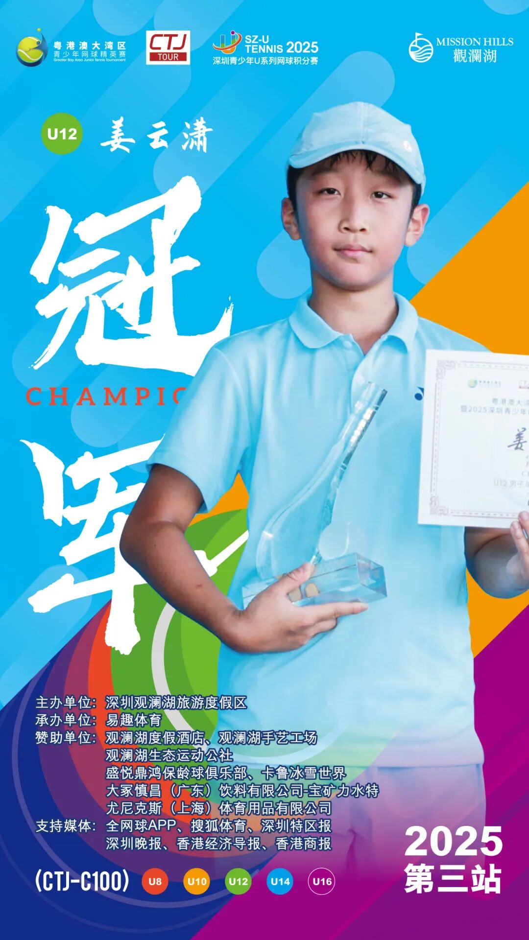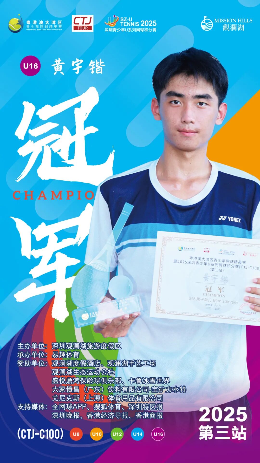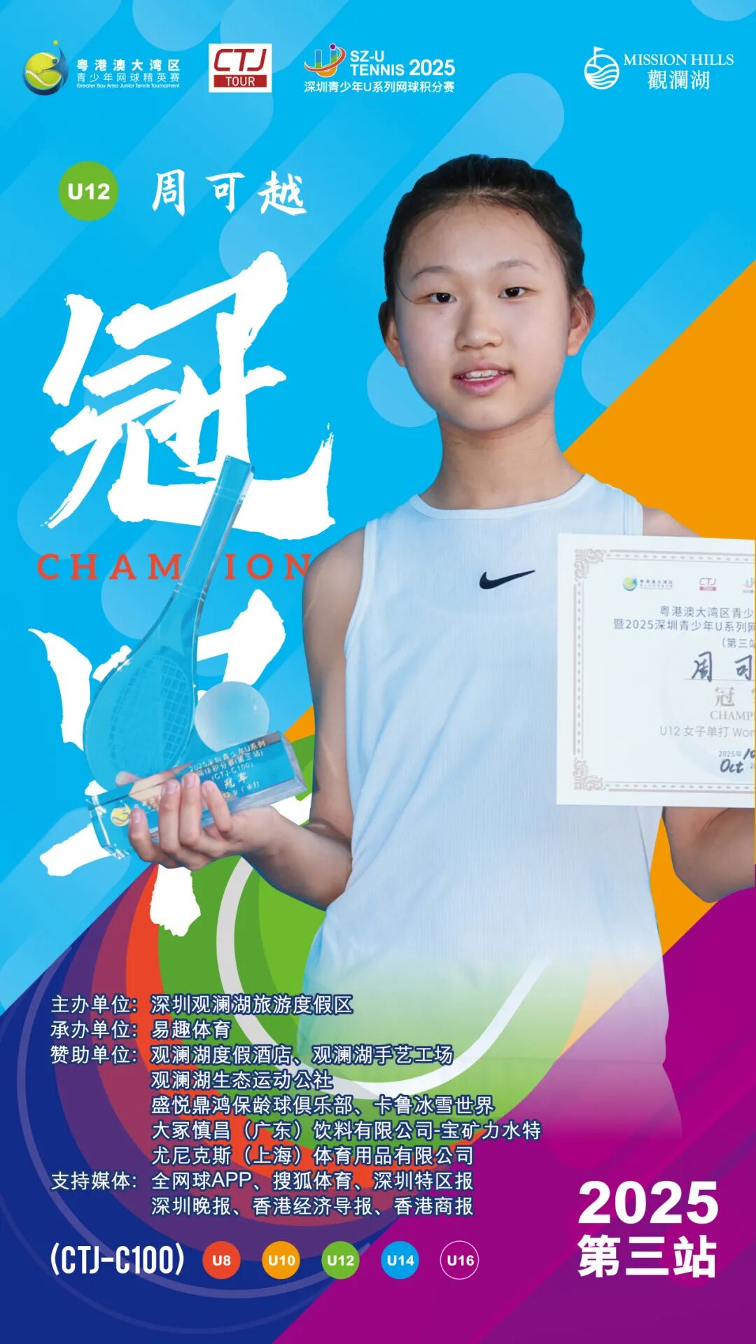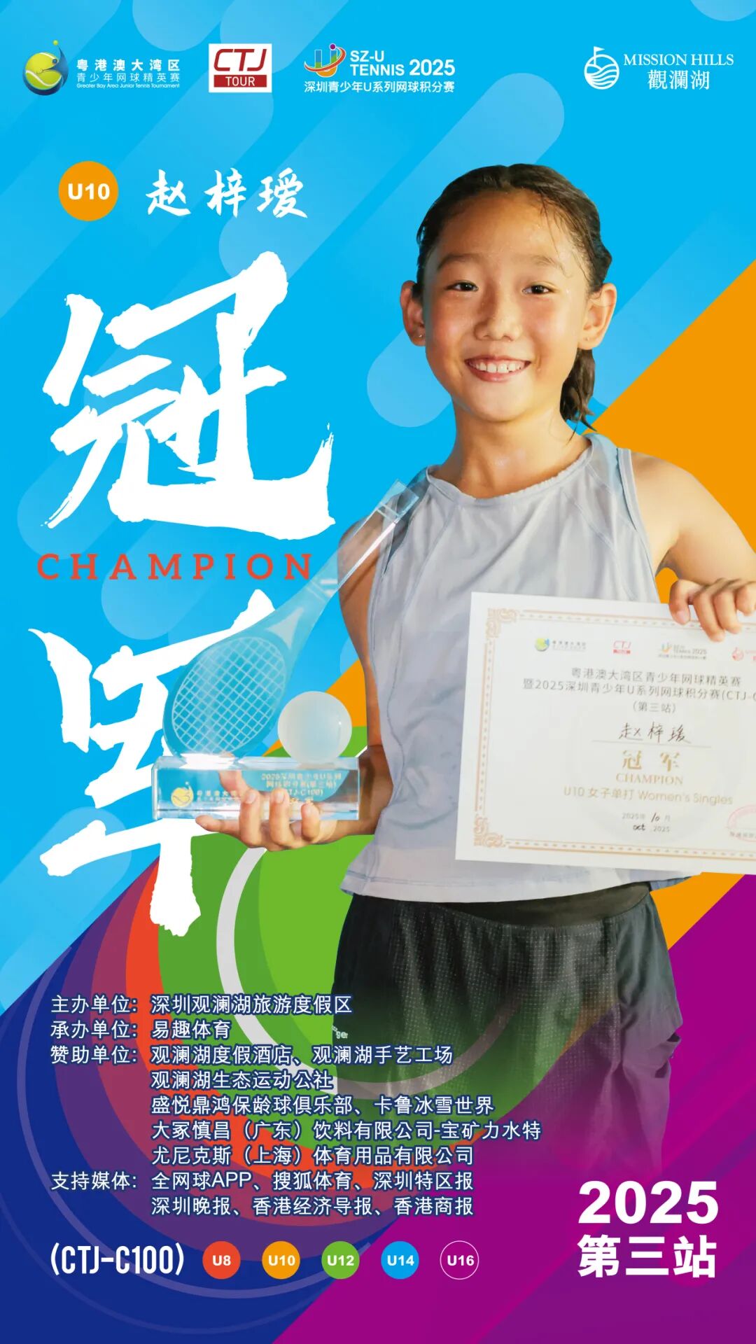 10月18-19日、10月25-26日,粤港澳大湾区网球精英赛暨2025深圳青少年U系列网球积分赛第三站(CTJ-C100)在深圳市观澜湖生态运动公社网球中心圆满收官。本次比赛经过四天激烈角逐,决出U8短网、U10男女单打、U12男女单打、U14男子单打、U16男子单打七个组别冠军。