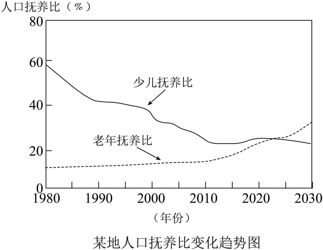 4. 人口抚养比是指总体人口中非劳动年龄人口数与劳动年龄人口数之比(通常用百分比表示),说明每100名劳动年龄人口大致要负担的非劳动年龄人口数量。下图反映了某地人口抚养比变化趋势,从图中可以推断出该地( )