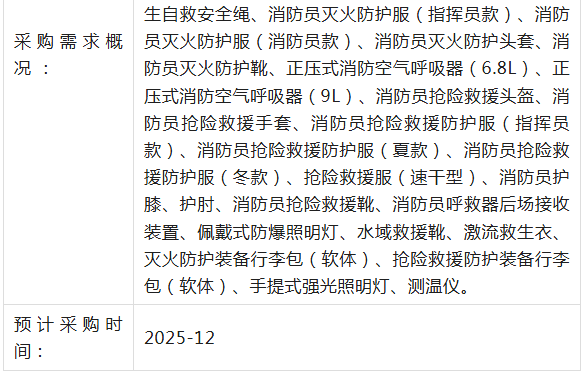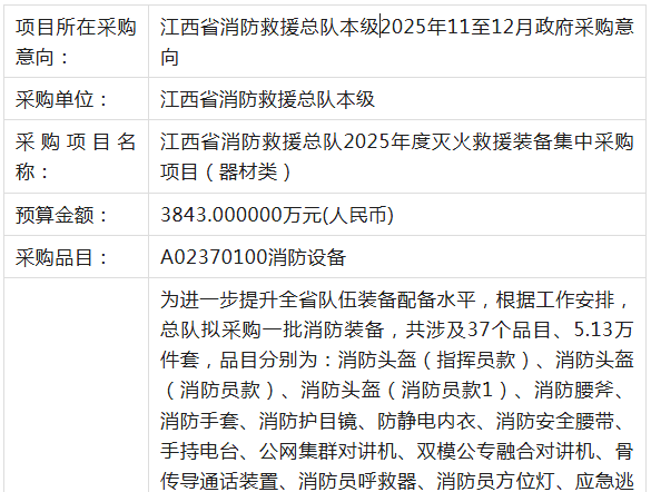 江西省消防救援总队2025年度灭火救援装备集中采购项目(器材类)政府采购意向