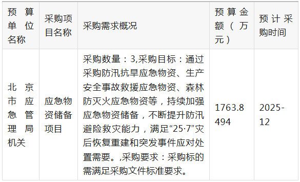 为便于供应商及时了解政府采购信息,根据《财政部关于开展政府采购意向公开工作的通知》(财库[2020]10号)等有关规定, 现将北京市应急管理局机关2025 年 1 (至)12 月采购意向公开如下: