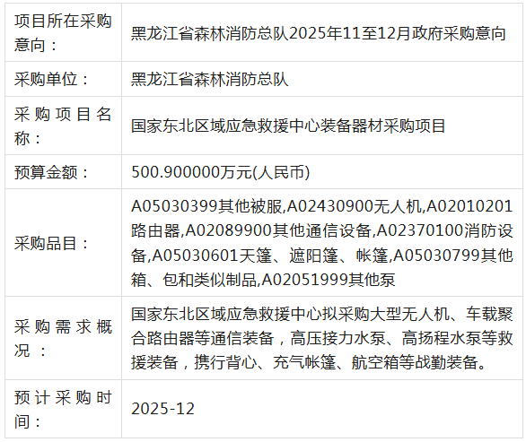 黑龙江省森林消防总队国家东北区域应急救援中心装备器材采购项目政府采购意向