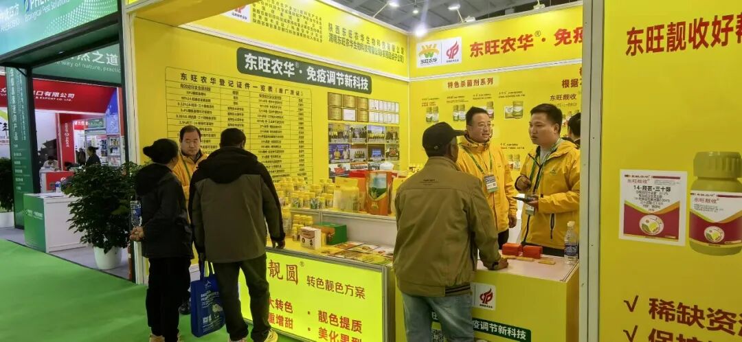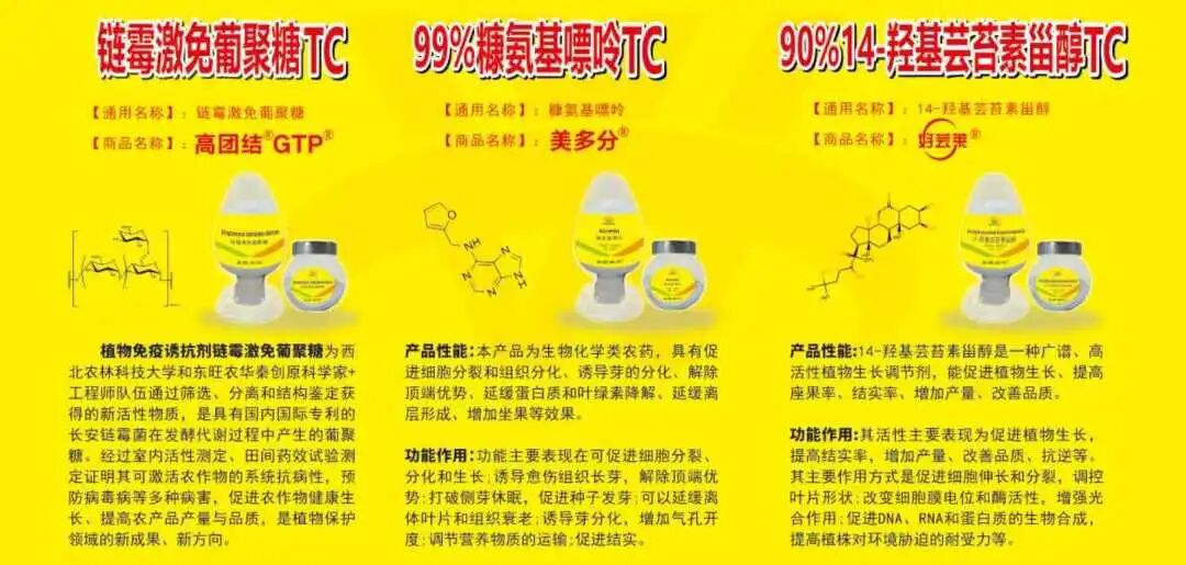 陕西东旺农华生物科技有限公司以品牌主题色“丰收之黄”盛装亮相,凭借专业的产品技术与创新的解决方案,成为本届展会的焦点。公司携一系列前沿技术与创新产品参展,长安链霉菌的发酵代谢产物植物免疫诱抗剂“链霉激免葡聚糖”,获国内国际专利,其成果转化产品高团结GTP®磷脂多糖系列,以及美多分®(99%糠氨基嘌呤TC)、好芸莱®(90%14-羟基芸苔素甾醇TC)等。