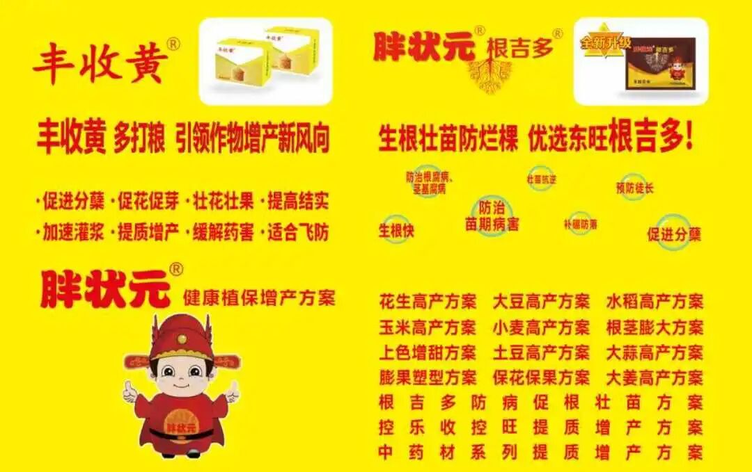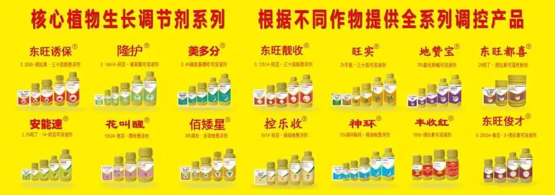 新型高效植物生长调节剂系列:东旺靓收®(0.12%14-羟芸·三十醇SC)、东旺诱保®(0.35%S-诱抗素·三十烷醇SC)、安能速®(2.5%吲丁·14-羟芸SL)、美多分®(0.4%糠氨基嘌呤SL)、旺实®(2%苄氨·三十烷SL)、花叫醒®(10%24-表芸·嘌呤SC)、控乐收®(6%14-羟芸·烯效唑SC)、隆护®(0.16%14-羟芸·噻苯隆SL)、佰矮星®(30%矮壮·多效唑SC)、地赞宝®(70%氯化胆碱SL)、神环®(15%调环酸钙·烯效唑SC)、东旺都喜®(2%吲丁·诱抗素WP)、丰收红®(10%S-诱抗素SL)、好芸莱®(0.01%14-羟基芸苔素甾醇SL)等。