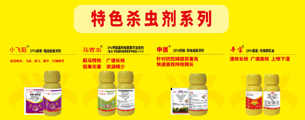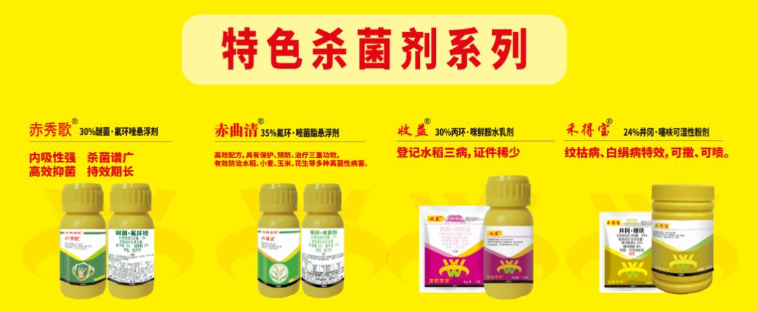特色杀菌剂系列:赤秀歌®(30%醚菌·氟环唑SC)、赤曲清®(35%氟环·嘧菌酯SC)等。特色杀虫剂系列:小飞挺®(37%联苯·噻虫胺SC)、申首®(25%阿维·茚虫威SC)等。