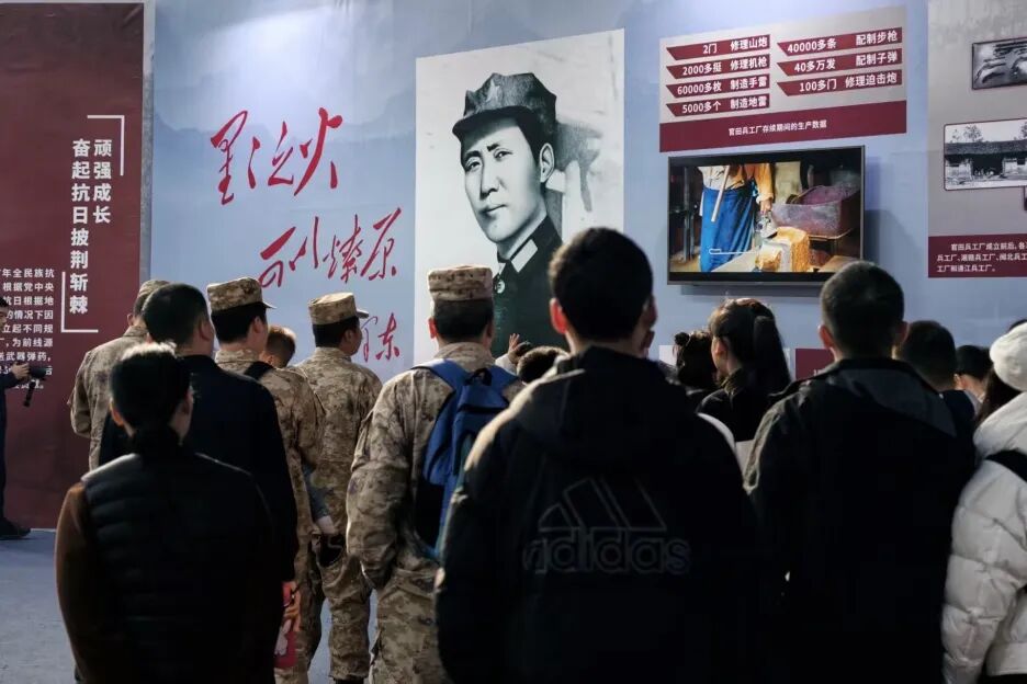 一走进场馆,首先映入眼帘的是“《挺起民族的脊梁》——党领导的人民军工”公益展。从1931年江西官田中央兵工厂的创立,到抗战时期敌后根据地的武器制造,从战场缴获到新中国军工体系的白手起家,再到两弹一星的横空出世和新时代自主创新的累累硕果——一幅幅历史照片,串联起党领导下的人民军工近百年奋斗足迹。