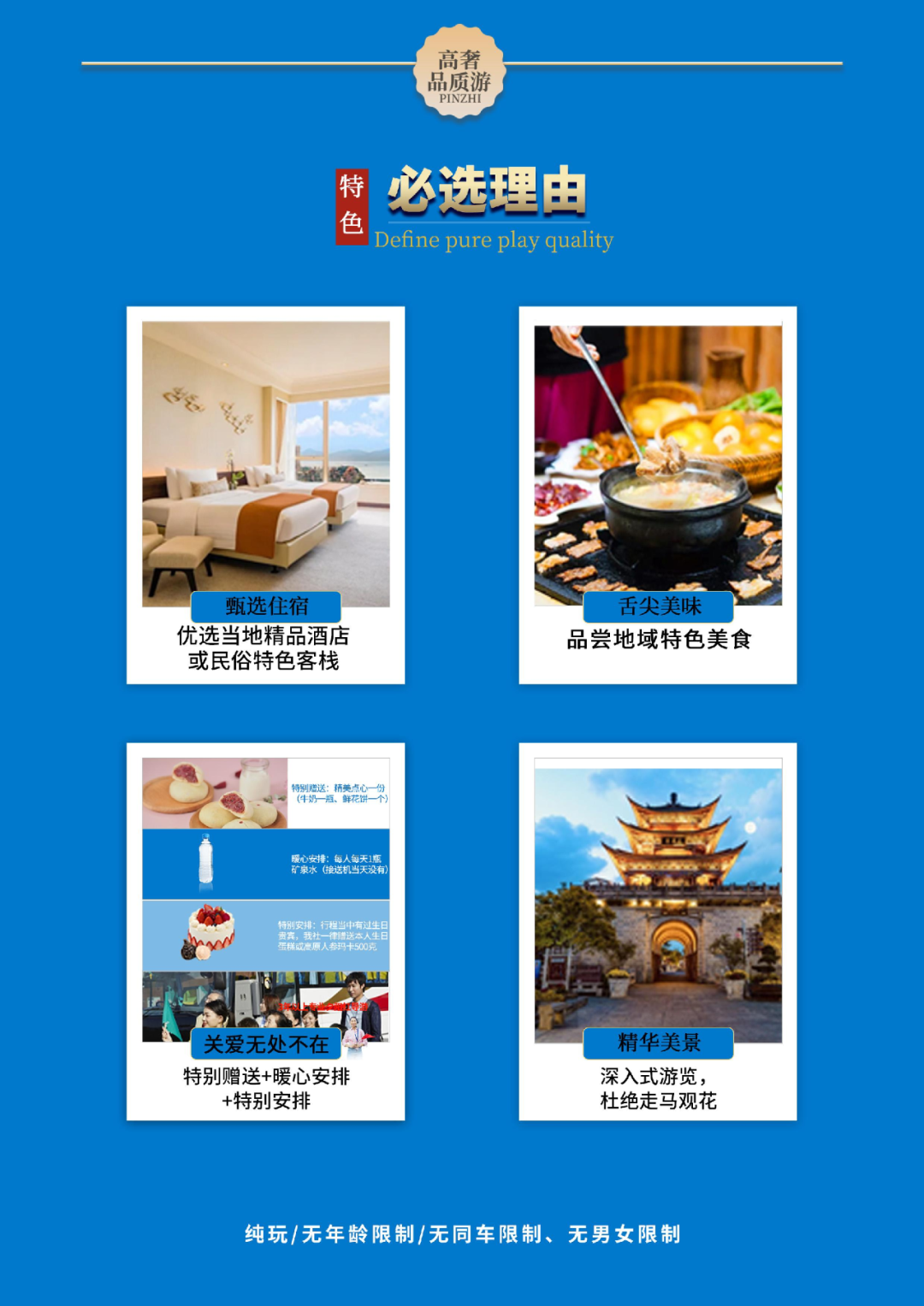2:住宿:优选当地精品酒店或民俗特色客栈,确保干净卫生,独立卫生间/24小时热水/WIF;房型为双
