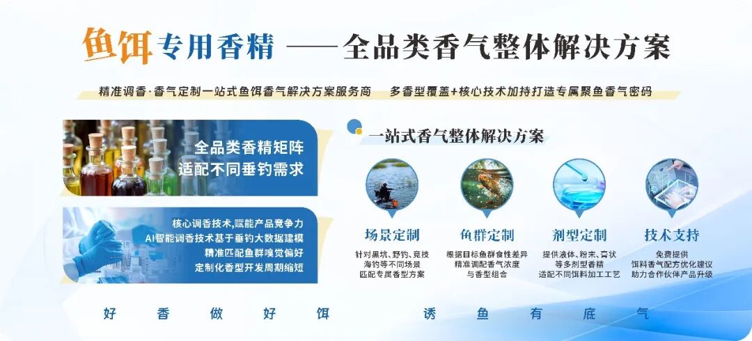 在垂钓场景中,香气是吸引鱼群的核心密钥。DDC深耕鱼饵香精领域多年,以“精准调香·香气定制”为核心,打造了覆盖全场景、全鱼群的一站式香气整体解决方案。
