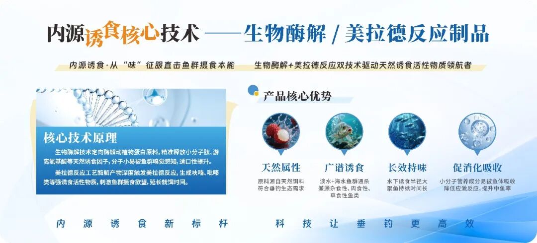 如果说香气是吸引鱼群的“敲门砖”,那么内源诱食技术就是激发鱼群摄食欲望的“核心引擎”。本次展会上,DDC将重点展示其依托生物酶解与美拉德反应双技术打造的内源诱食制品,这一技术突破了传统诱食剂的局限,从“味”的层面直击鱼群摄食本能。