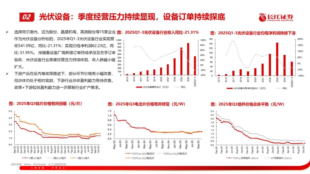 • 光伏设备仍陷“价格内卷”,营收下滑超20%,毛利率持续承压,行业等待政策引导与产能出清;
