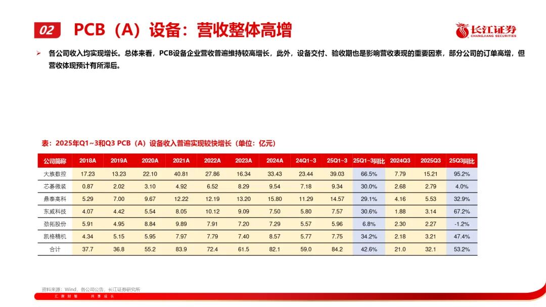 • PCB设备是最大黑马,在AI服务器与高端载板需求拉动下,行业营收增速超50%,龙头公司净利率大幅提升,盈利翻倍已成常态;