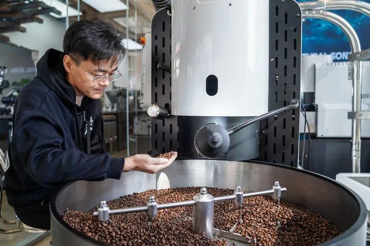 2025年12月10日,韩君玮在位于昆明的南来盛咖啡店内烘焙咖啡豆。