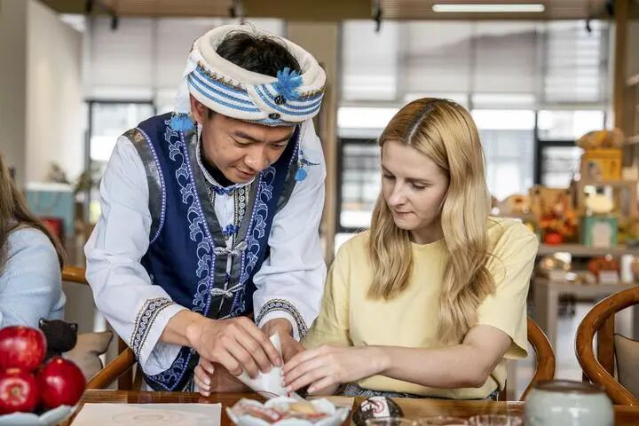 2024年4月13日,一名俄罗斯塔斯社记者(右)在大理市体验包装下关沱茶。据统计,2025年1月至6月,云南省接待入境过夜游客251.03万人次,同比增长86%。