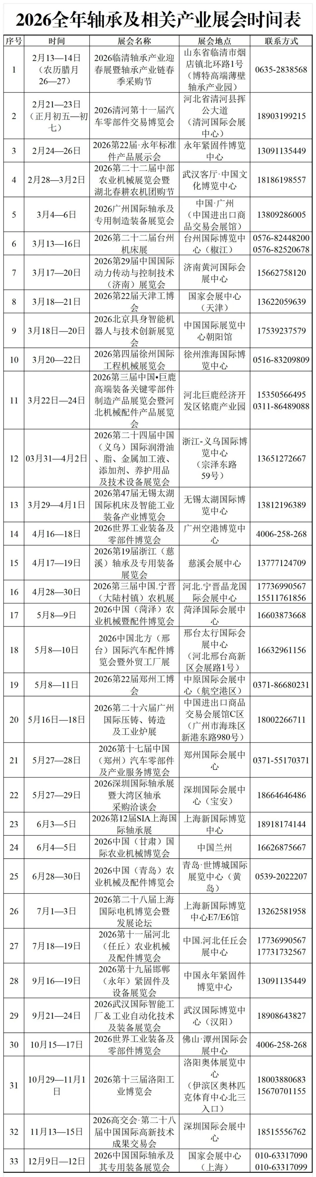 精准掌握行业展会信息,是拓展市场、对接资源、洞察行业趋势的关键。为帮助大家省去信息筛选的麻烦,小编整理了2026年全年各地轴承及上下游相关产业展会的完整时间表,涵盖临清、广州、上海、深圳等多个轴承产业核心聚集地,内容包含展会时间、地点、联系方式等关键信息,方便大家提前规划、高效参展,欢迎大家收藏备用!