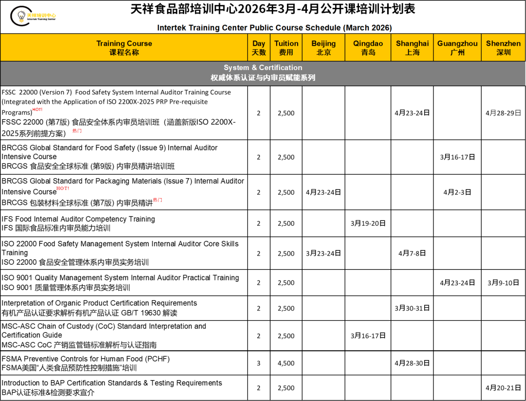 Intertek食品部3月-4月培训 矩阵全面焕新
