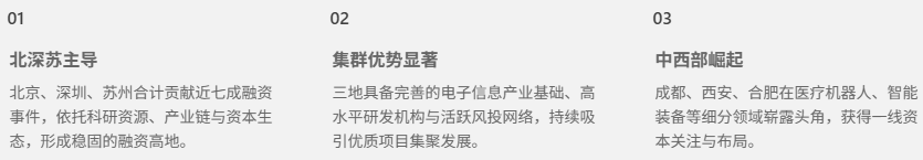 2. 地域集群效应显著北京、深圳、苏州形成稳固的“融资铁三角”,合计贡献了近七成融资事件。这背后是当地雄厚的高校科研资源、完备的电子信息产业链和活跃的风险投资生态共同作用的结果。